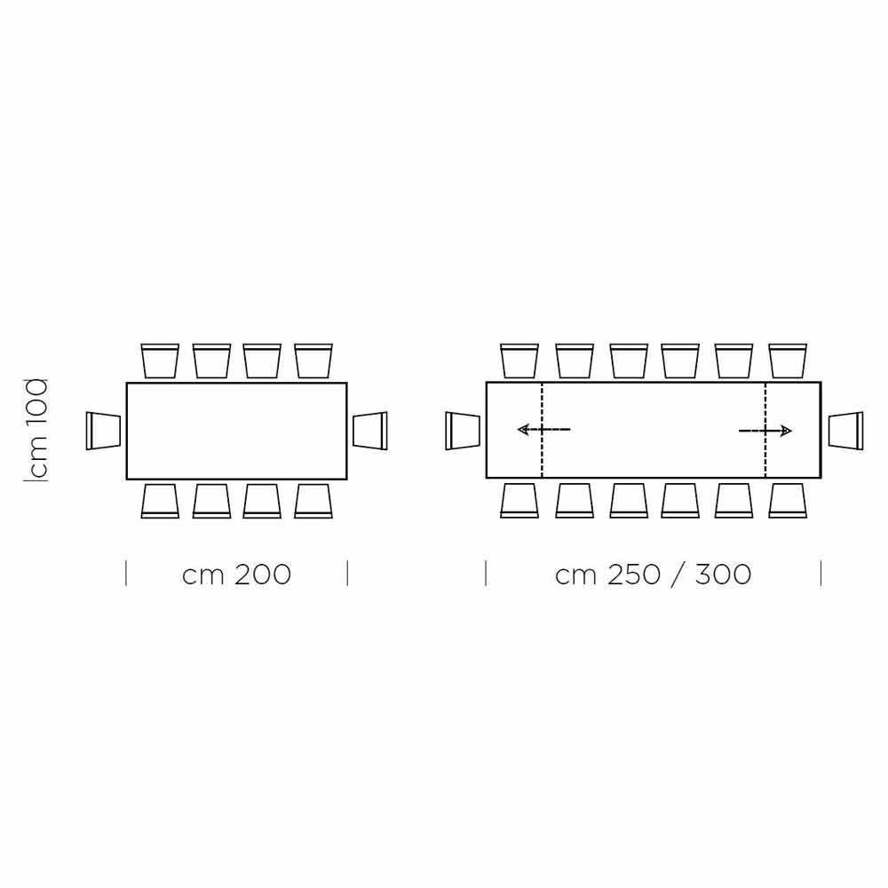 • L 200/300 x D 100 x H 75.5 cm 14 seats (2 extensions of 50 cm).