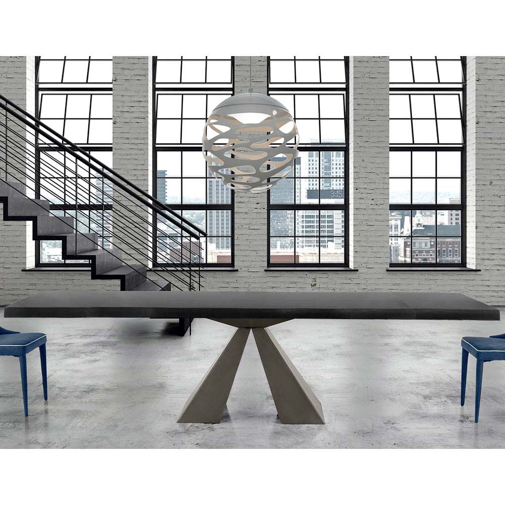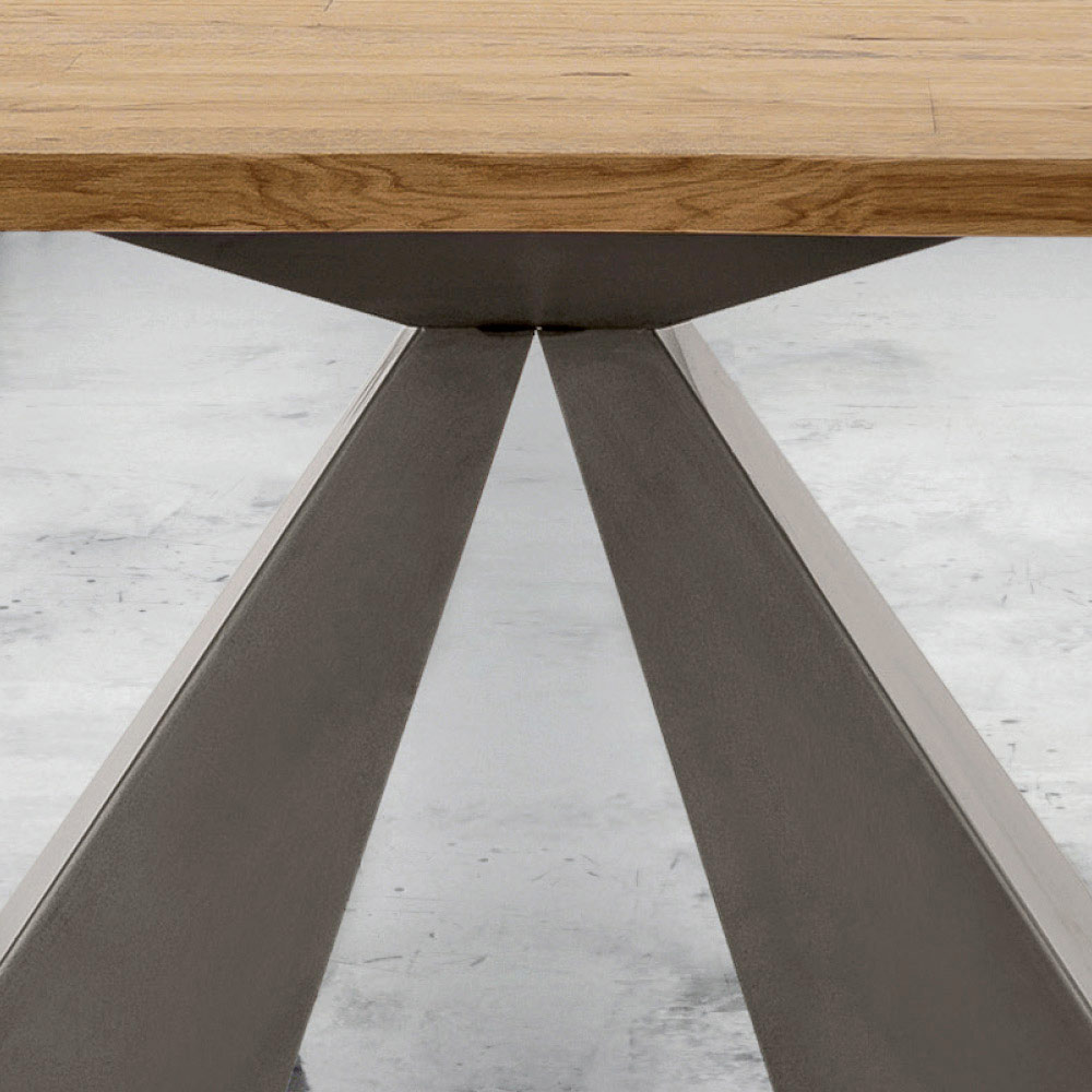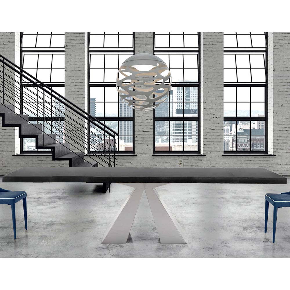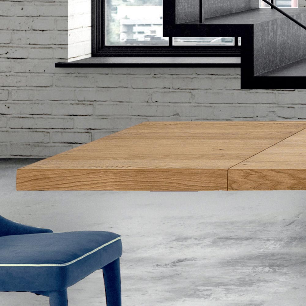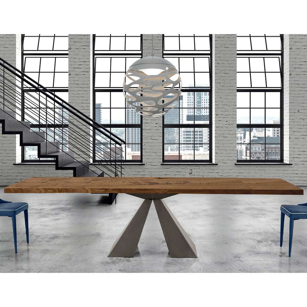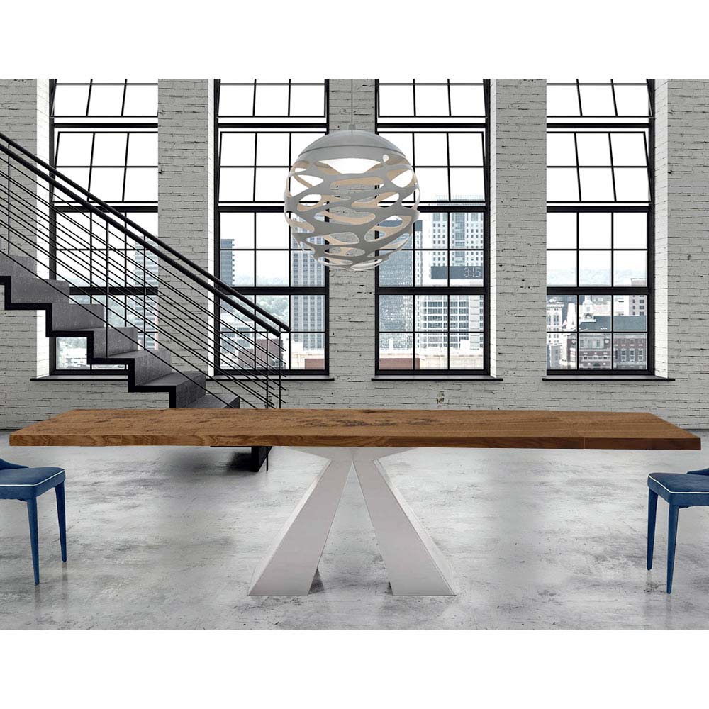 The Dalmata extendable dining table is characterized by an always refined and innovative design, perfect for integrating into your daily life. Handcrafted in Italy with excellent quality materials and 100% made in Italy. Composed of a veneered wood top with irregular debarked edge and a base in mink or white lacquered steel.