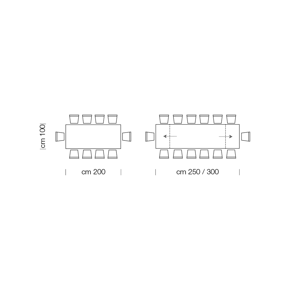 L 200 (300) x D 100 x H 76.5 cm 14 seater extendable with two 50cm external extensions.
