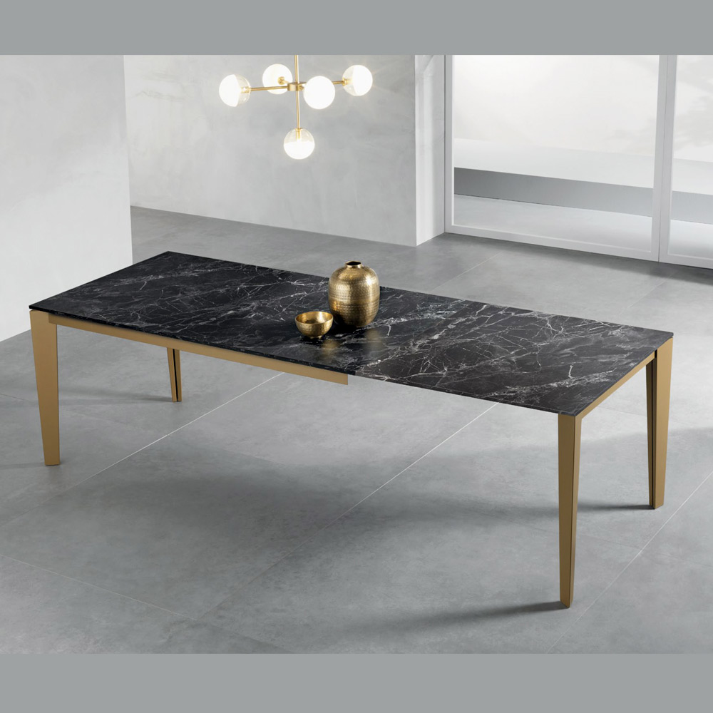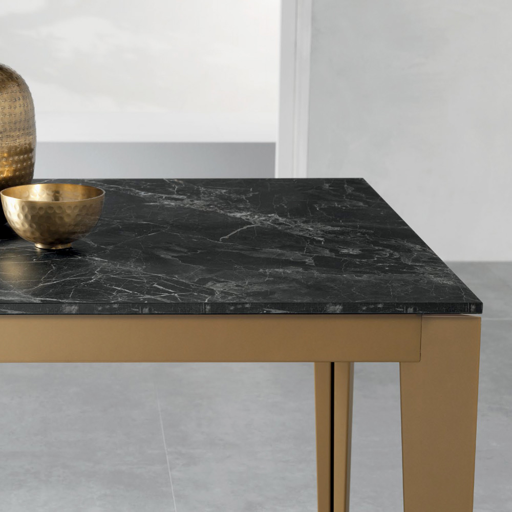 Elegant and functional, this extendable rectangular table combines modern design and practicality. The 18 mm thick dark marble-effect laminate top highlights the warm, authentic grain of the marble, while the aged gold painted metal legs add stability and a contemporary touch.