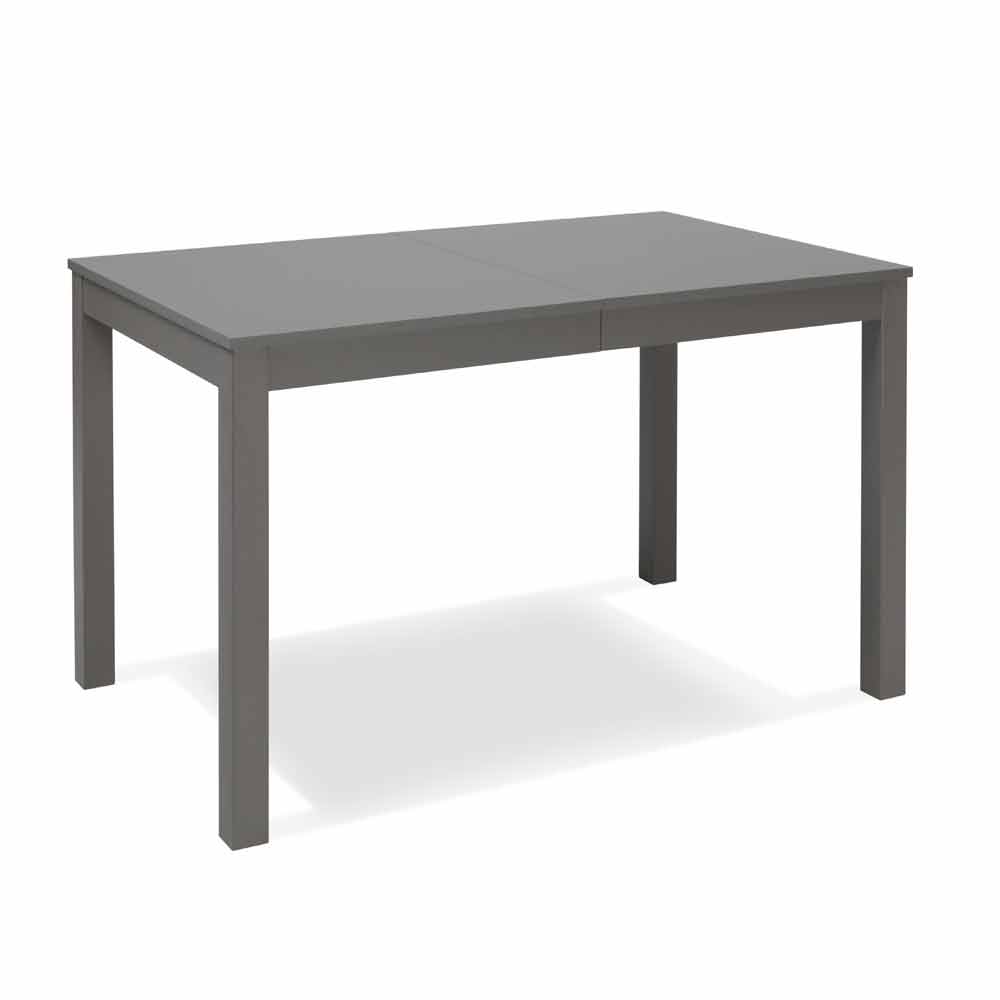 Extendable dining table with legs in solid beech wood in light gray color. Top, bands and extensions in light gray melamine. The extensions are inserted into the table.