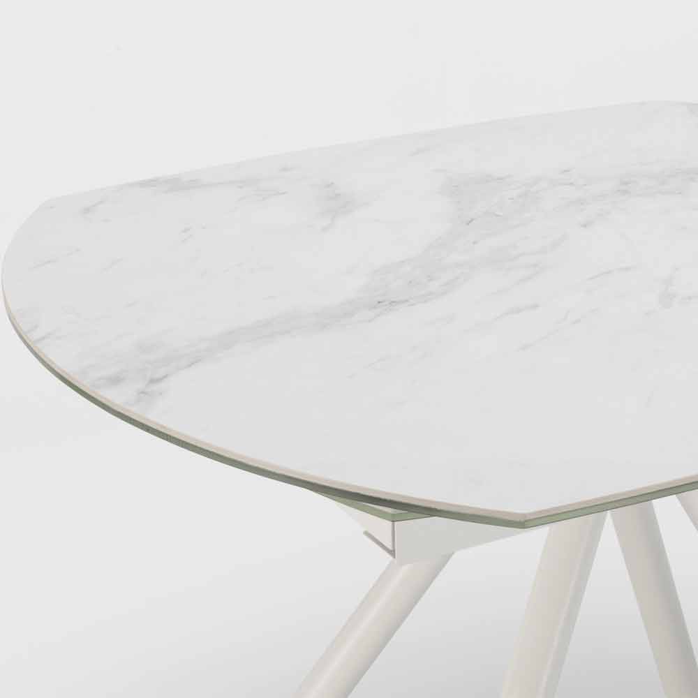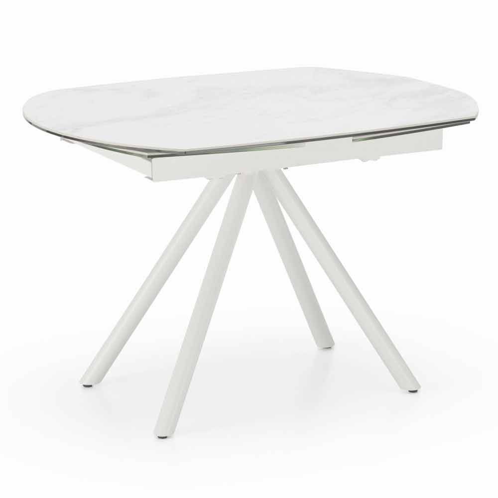 Made with a structure and legs in white painted metal and with a marble-effect ceramic top.