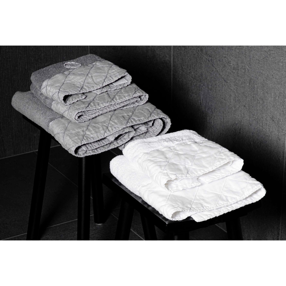 The value of tradition joins the modern lifestyle with the white cotton terry face towel with geometric decoration .