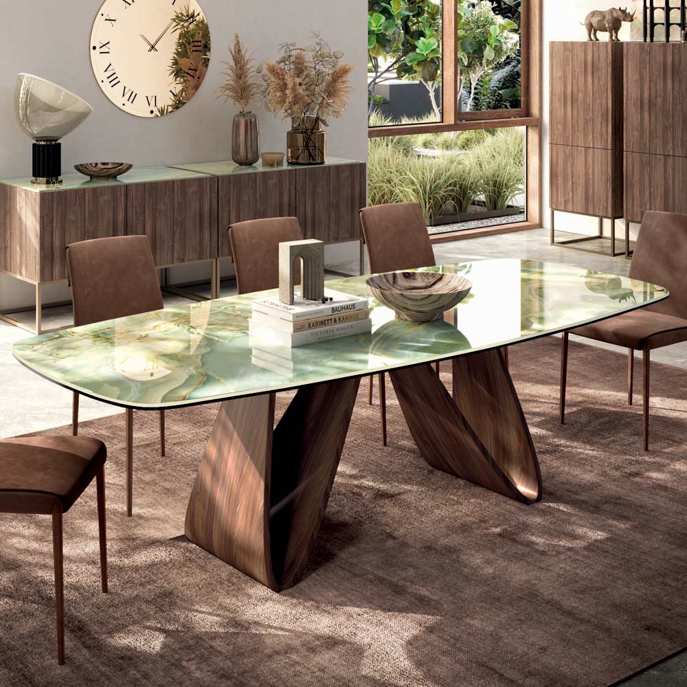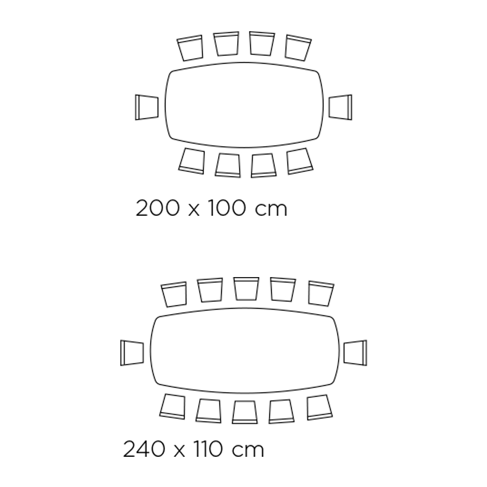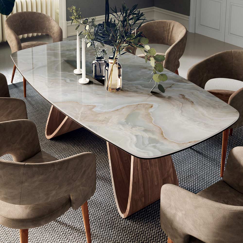 Thanks to the shape of the base and the available top finishes, the table is capable of giving a