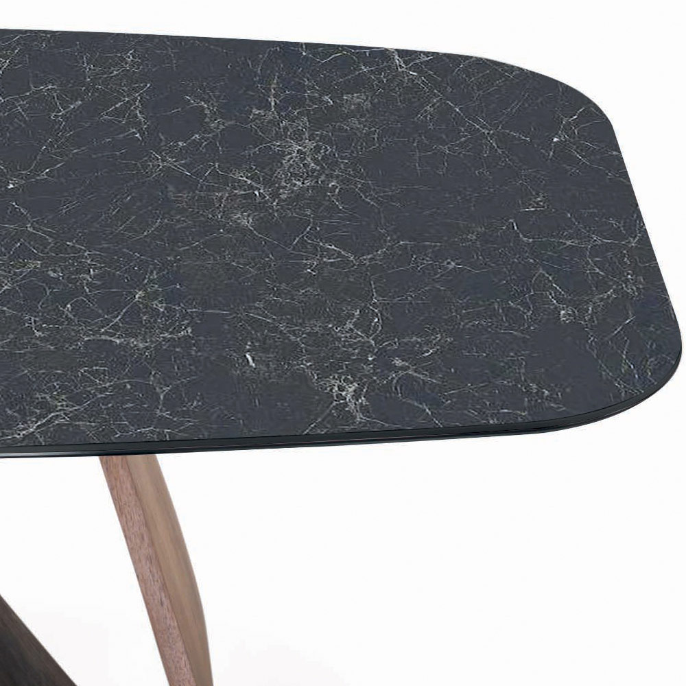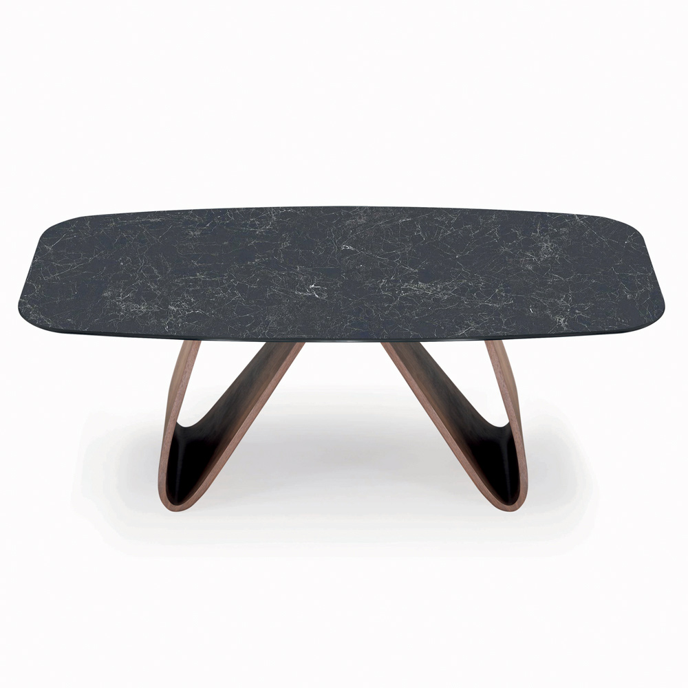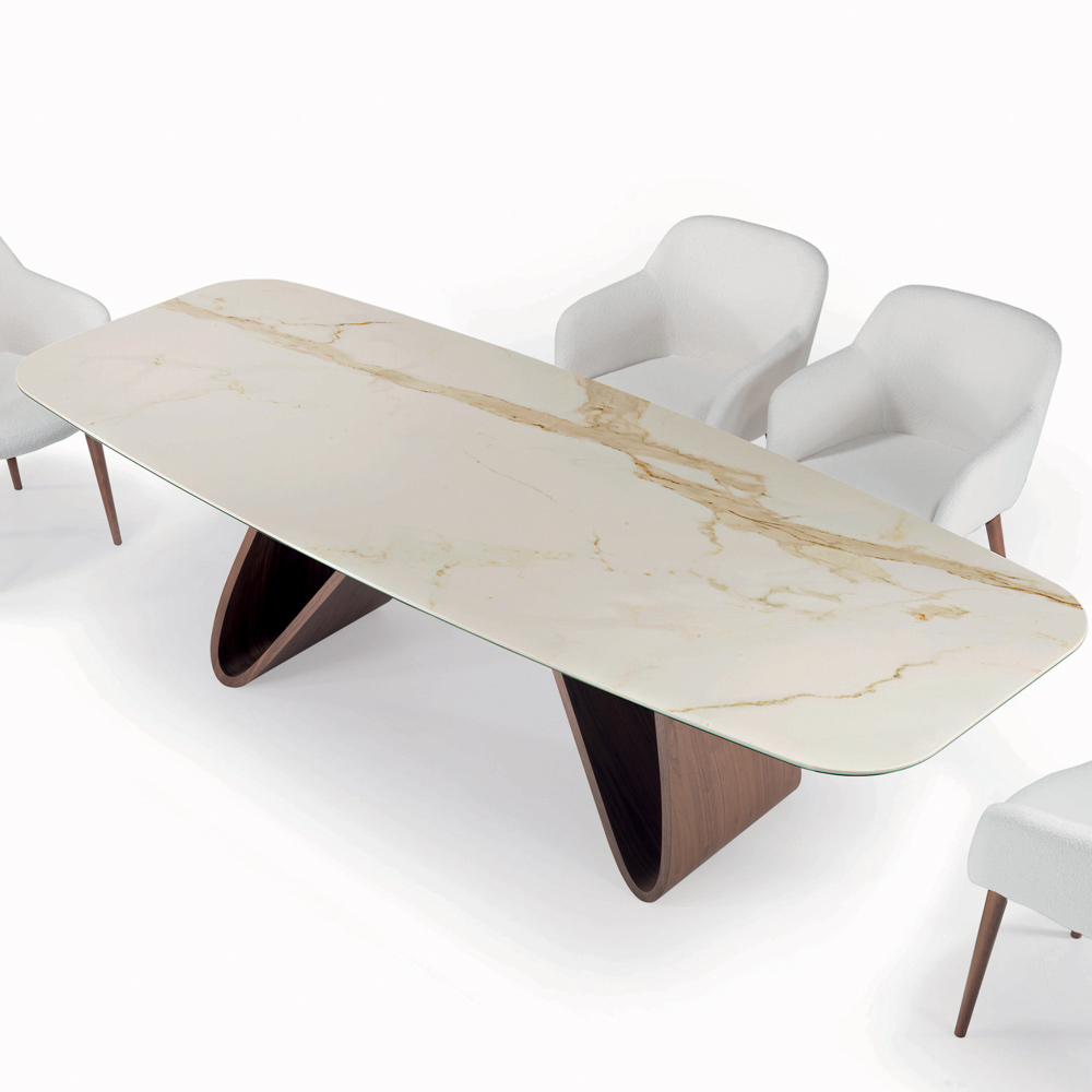 Thanks to the shape of the base and the available top finishes, the table is capable of giving a
