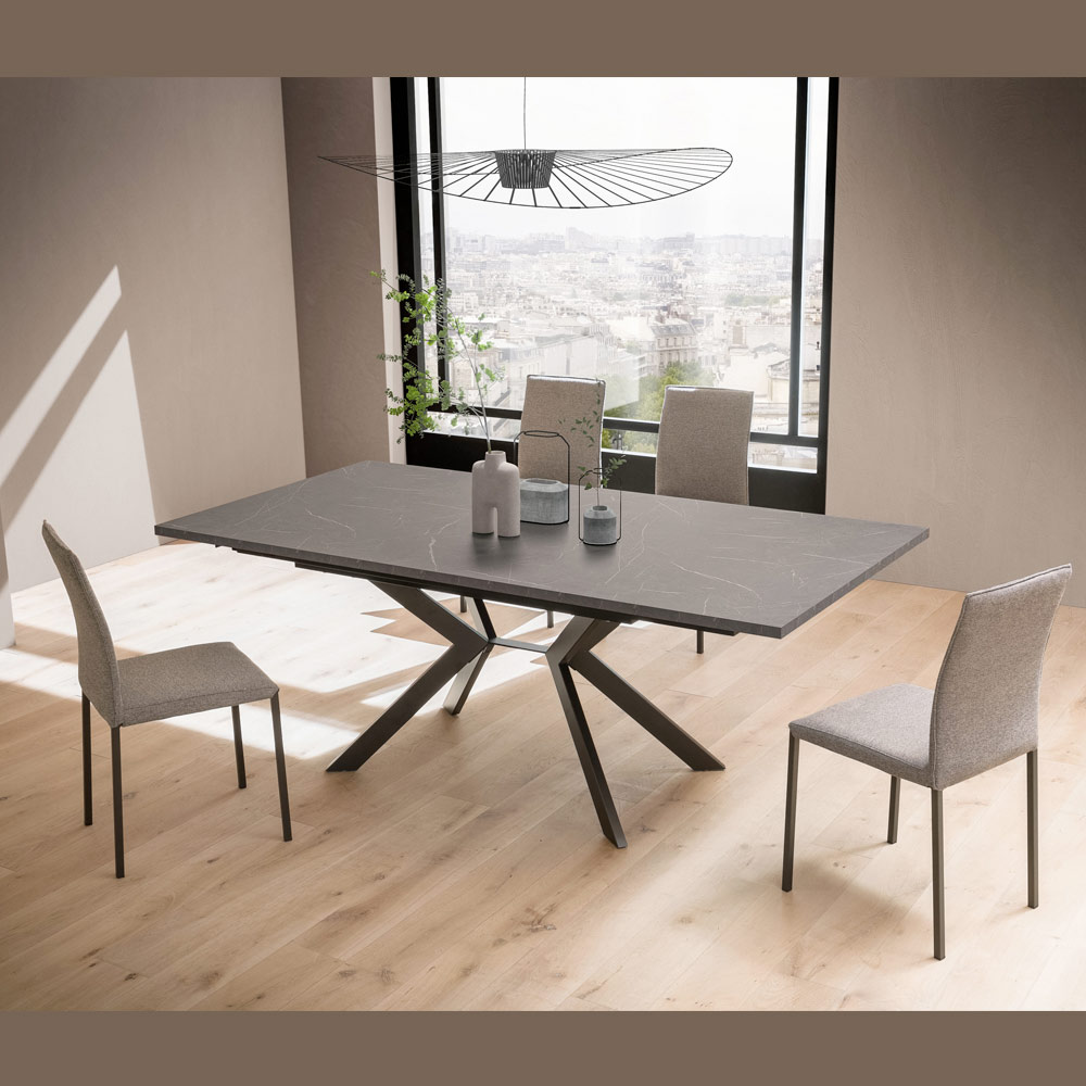 The base, in painted metal and with a crossed geometric design, offers stability and a sculptural touch that does not go unnoticed. A perfect furnishing solution for dining rooms, open spaces or contract environments with a refined style.
