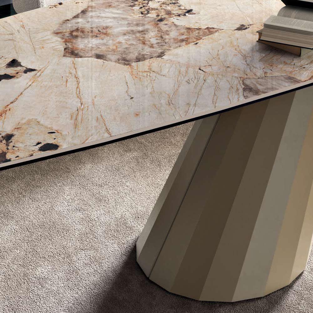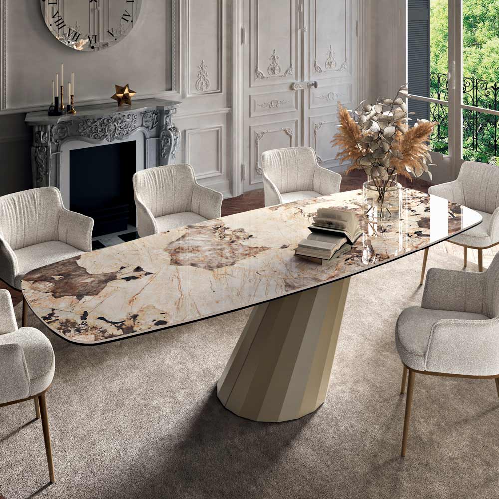refinement of the shape of the base combined with the finish of the top you choose creates a unique table, with a great visual impact that furnishes everyday and contract environments with
