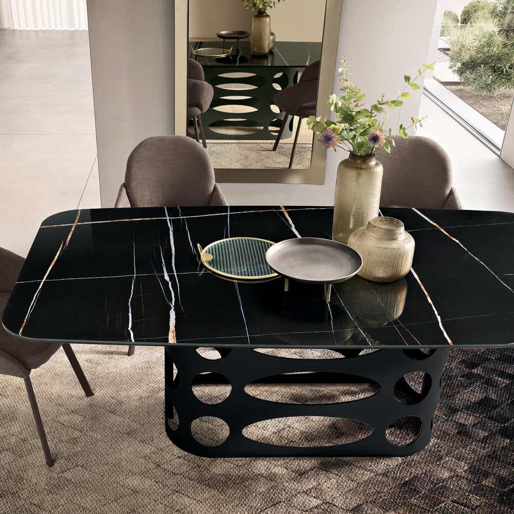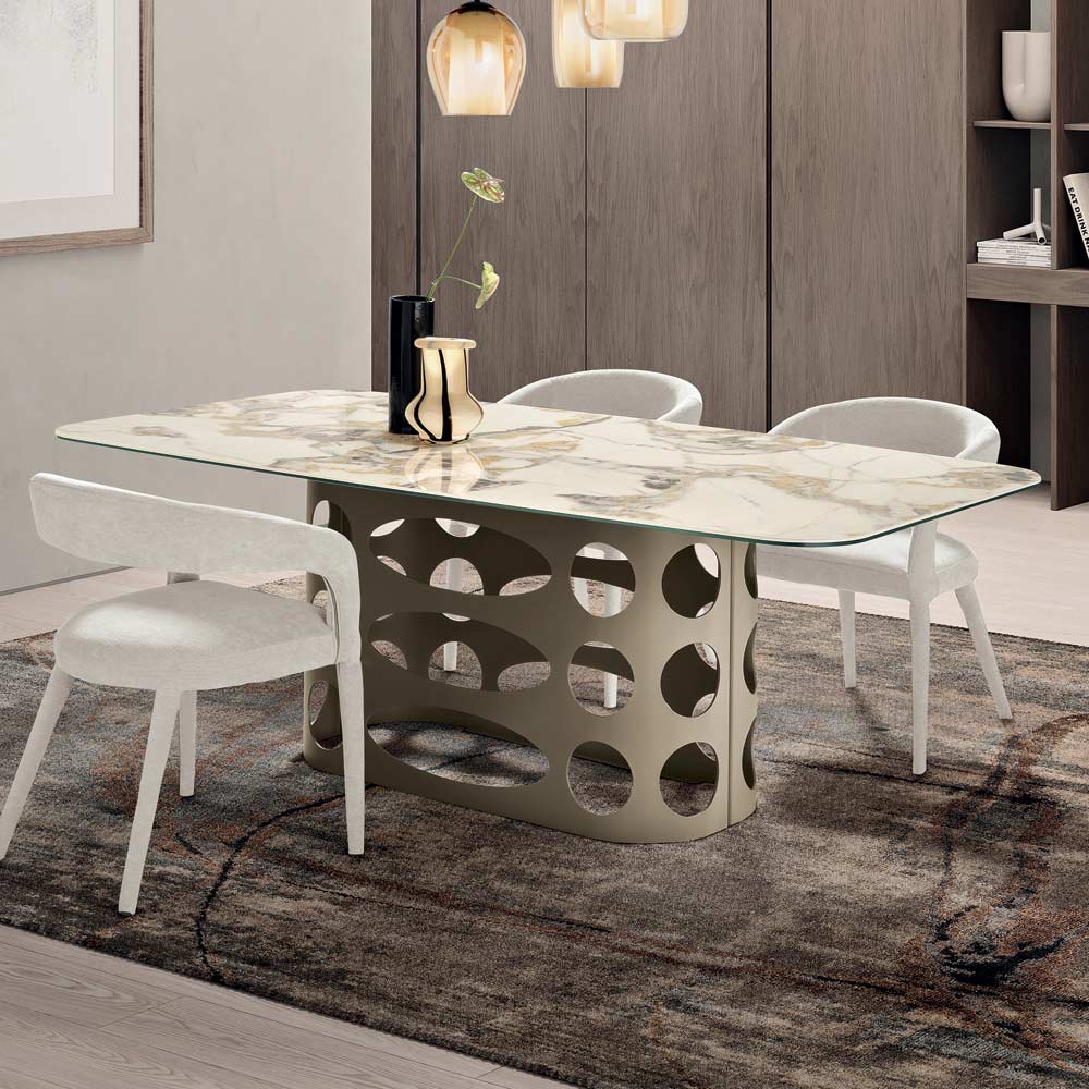 An elegant, Made in Italy designer dining table , ideal for stylishly furnishing your dining room or living area . The table features an original painted metal base with refined elliptical and circular perforations , a distinctive detail that creates a striking graphic interplay of solids and voids, making the structure light yet dramatic.