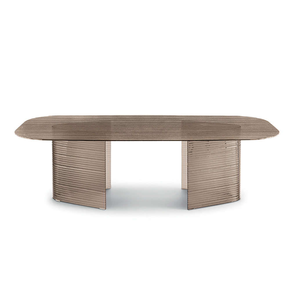 The distinctive base, composed of two curved elements, creates a sculptural and dynamic structure that becomes the true protagonist of the table. The transparency of the glass enhances the design and keeps spaces visually light, making it perfect for modern and elegant settings.