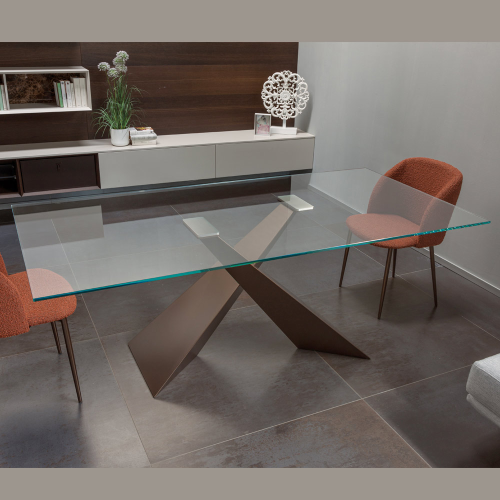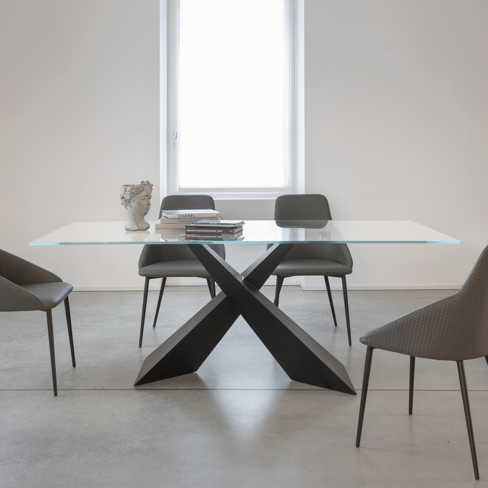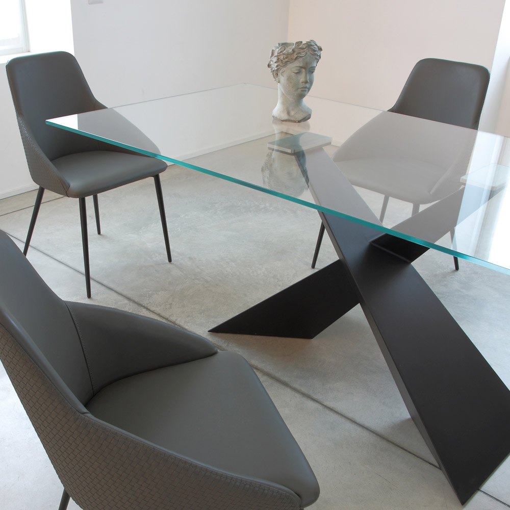 The absolute protagonist is the crossed base in painted metal , with a geometric and dynamic design. The decisive lines create a sculptural and architectural effect, transforming the table into a real furnishing element.