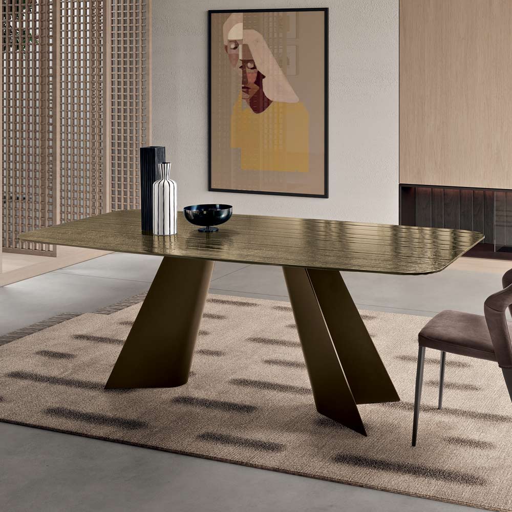 The distinctive painted metal base is composed of two slender, soft-V-shaped elements that taper toward the top, creating an elegant and dynamic structure. This configuration gives the table a visual lightness while also ensuring the structure's stability and solidity.