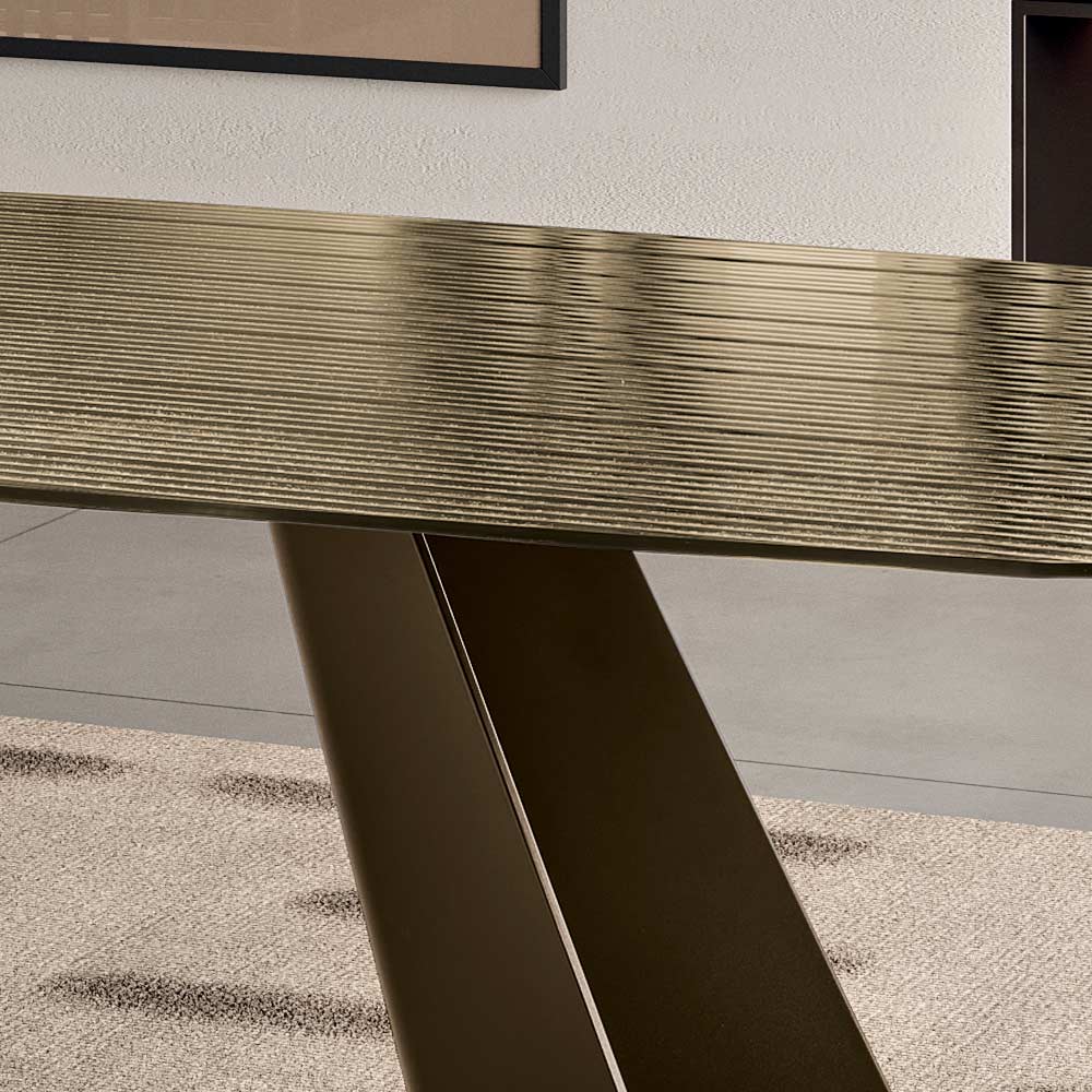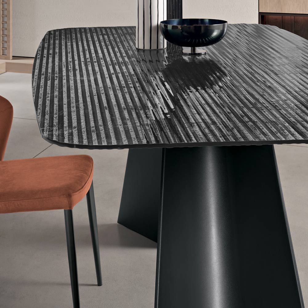 A refined, Made in Italy designer dining table designed to elegantly enhance the dining room or living area . The table stands out for its back-silvered, ribbed glass top , a luminous material that reflects light, creating evocative visual effects and lending the room a sophisticated look.