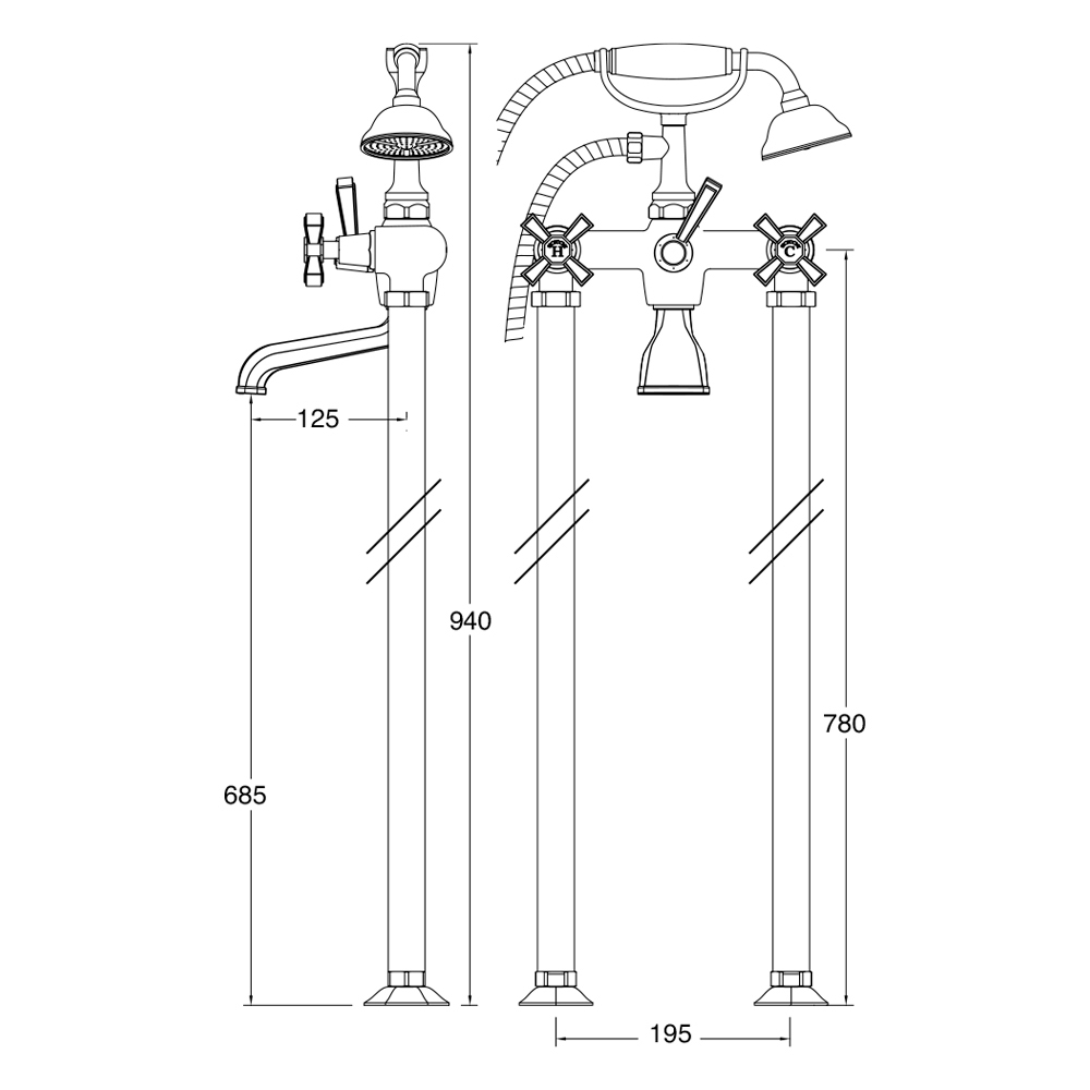Silvana è a bold floor bathtub assembly with hand shower and flexible hose, made of brass.