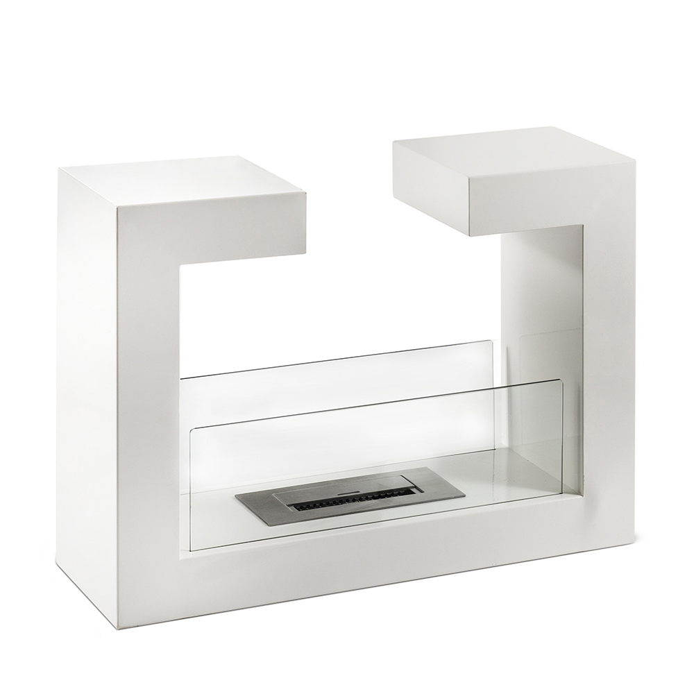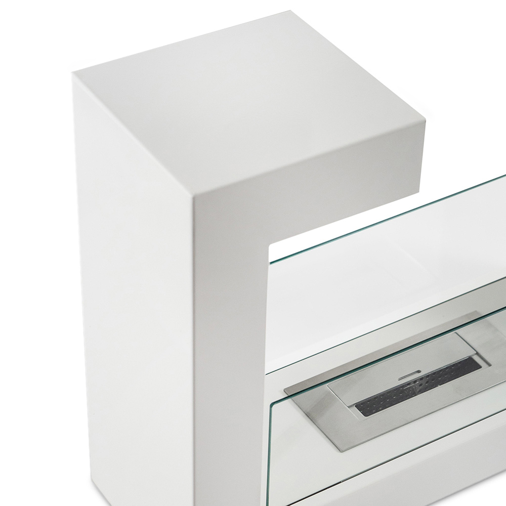 Bioethanol floor fireplace with structure made of white painted metal and transparent tempered glass useful for protecting the flame from any gusts of wind, highlighting it. Complete with flame control tool and instruction manual. An ideal furnishing element for heating domestic and contract environments both indoors and outdoors in a functional and elegant way. Its refined and exclusive design makes it Ā also appreciated when turned off as it completes the surrounding space through a touch of refined and elegant style .