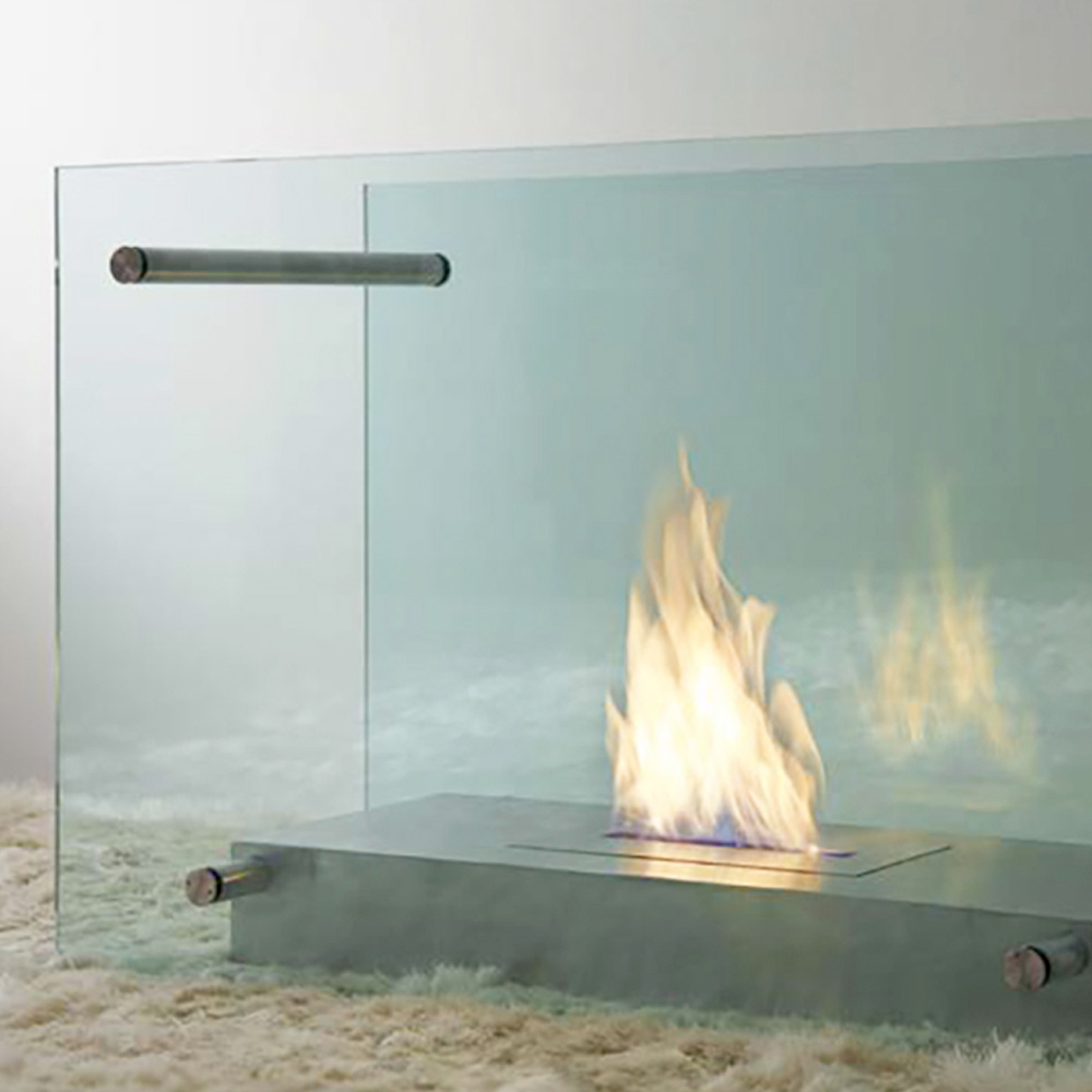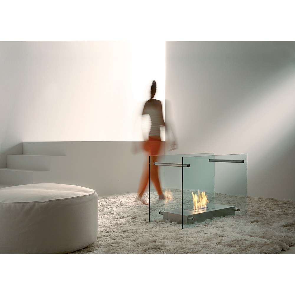 Elegant and seductive, this indoor bio-fireplace is an intriguing game of volumes and transparencies that can be placed in the
