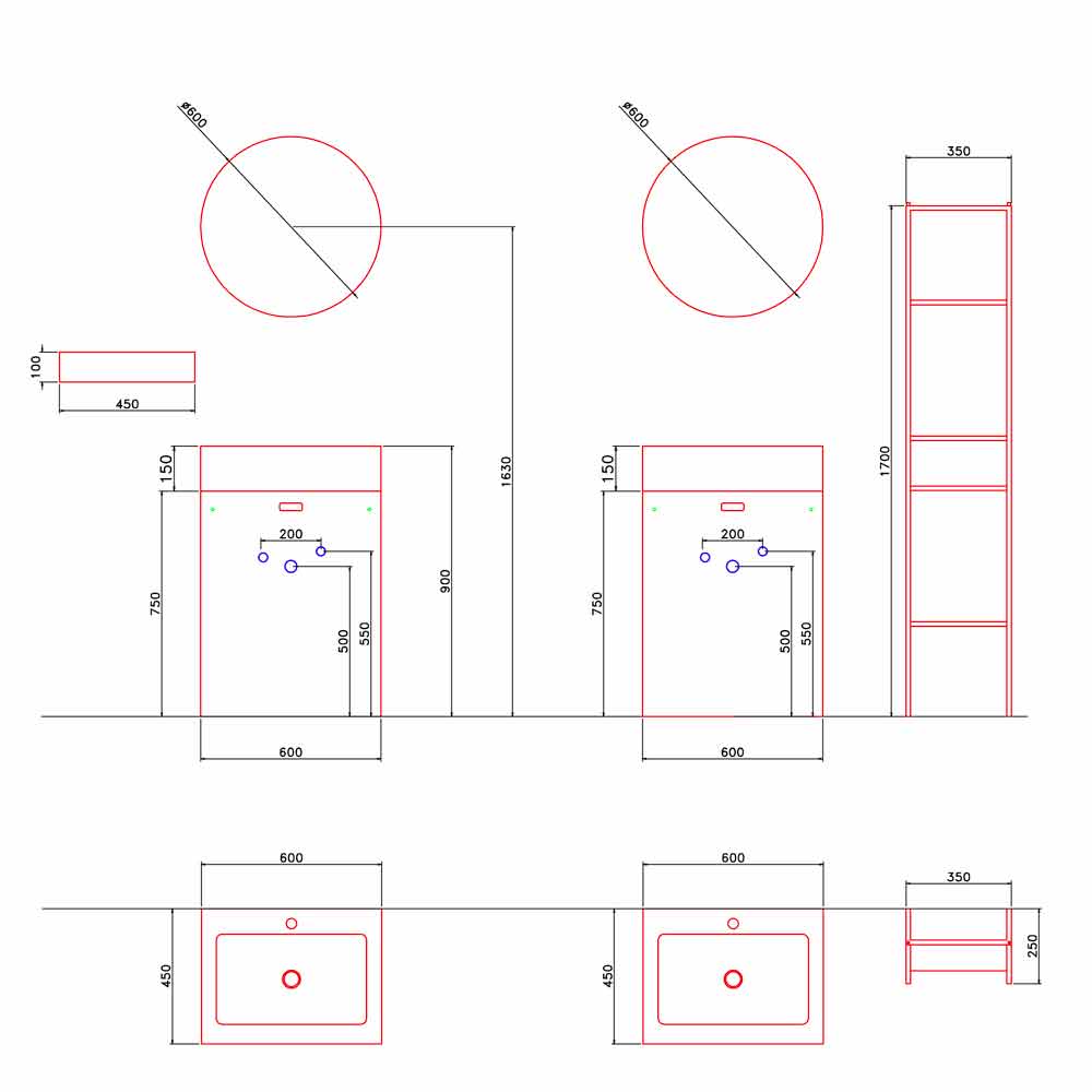 Composition is in white knotted oak , dark gray concrete washbasins.