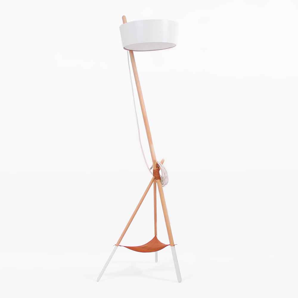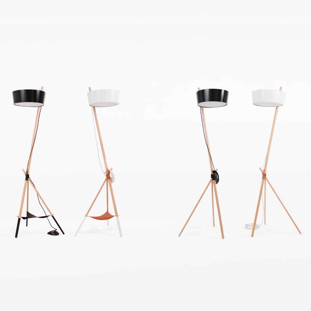 Design floor lamp in solid beech wood and lacquered steel.