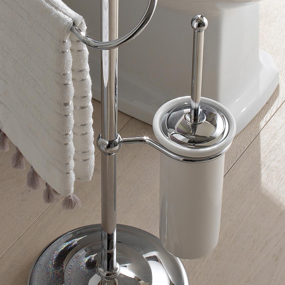Handcrafted in Italy with high quality materials. The structure is made of brass, the soap dish is ceramic. A practical toilet brush holder, also in ceramic, is available as an option.