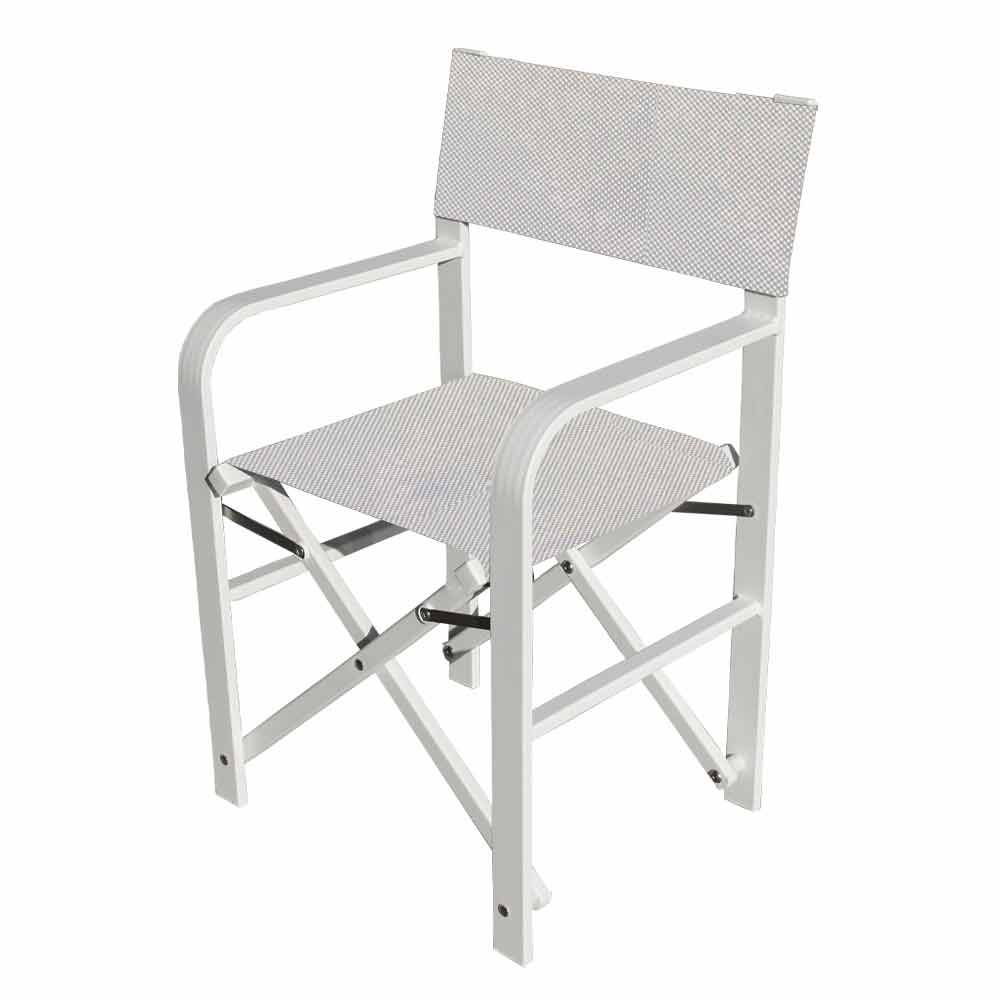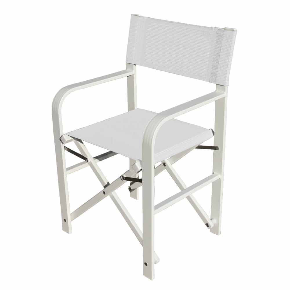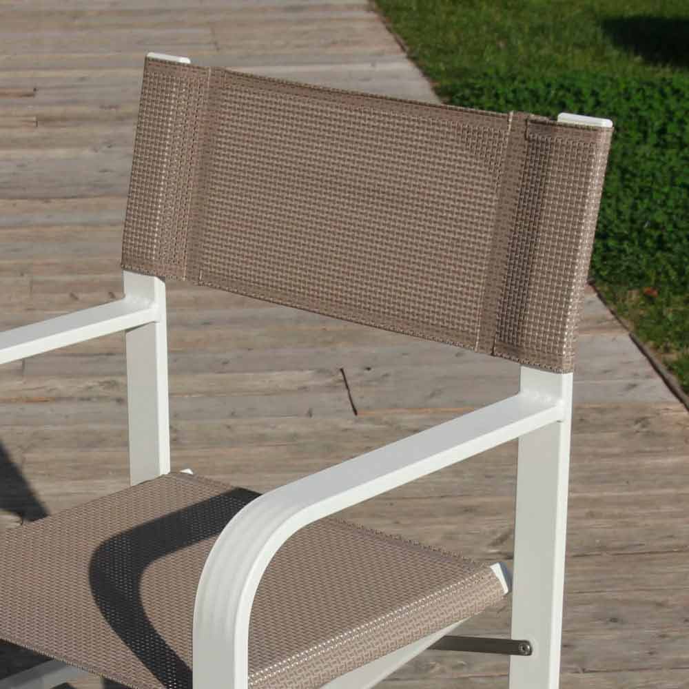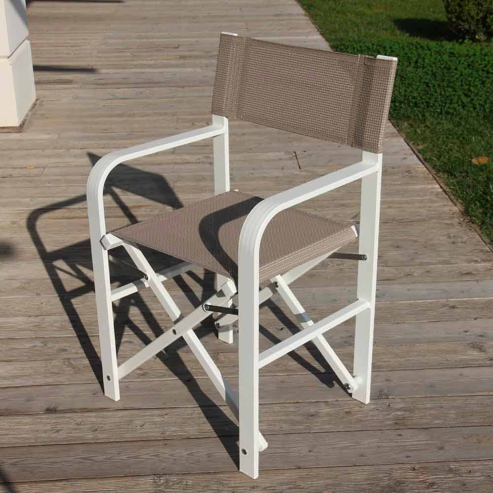 Outdoor chair with structure in powder-coated aluminum and seat in continuous thread of polyester covered in pvc, made in Italy . A furnishing solution for outdoor environments ideal for those who love practicality and functionality, elements conferred by the comfortable and welcoming seat and the folding structure that allows you to easily close the chair for a minimum size . Thanks to its modern and essential design it adapts perfectly to the most varied contexts, bringing with it all its sober and eclectic personality . The various finishes available also give it a particularly versatile character, managing to satisfy any request and need in the best possible way. The high quality materials used together with the 100% Made in Italy workmanship bring to life a light and extremely robust seat ideal for outdoor furniture of bars, gardens but also beaches and swimming pools.