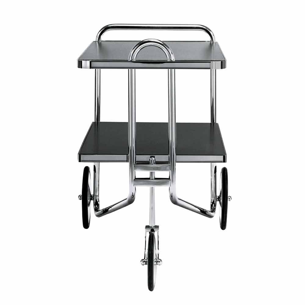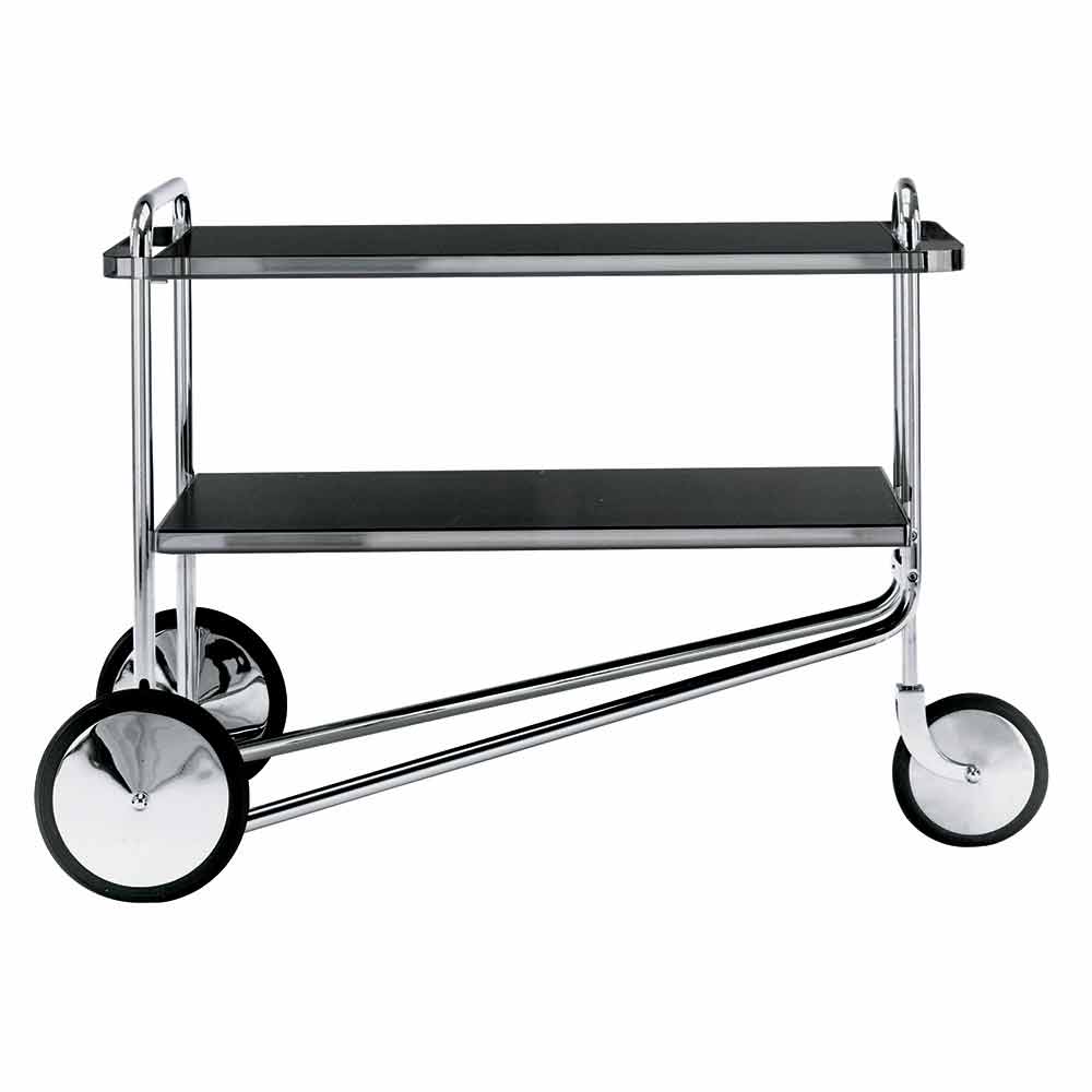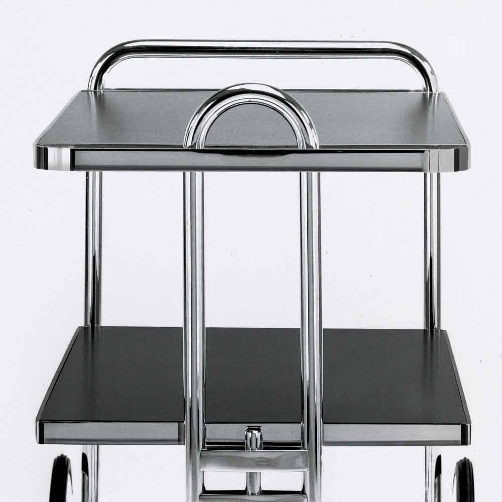 Chromed steel food trolley with black laminate shelves Made in Italy.