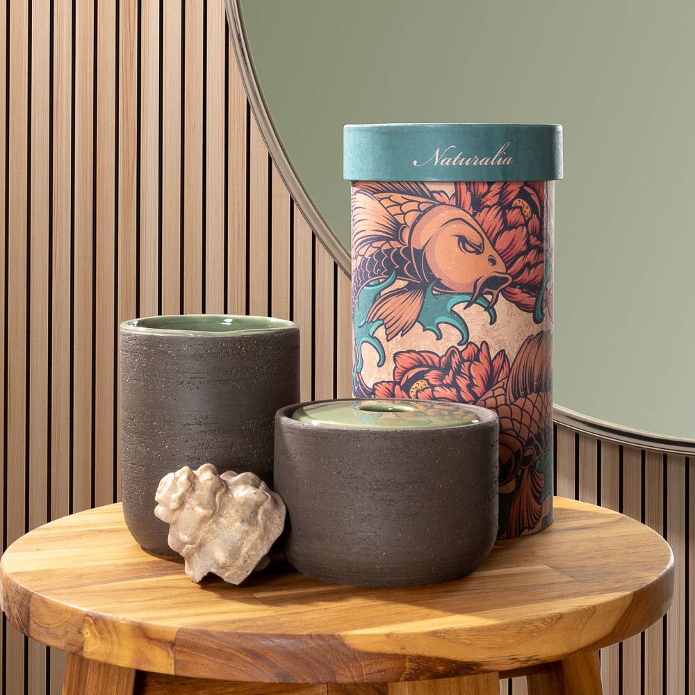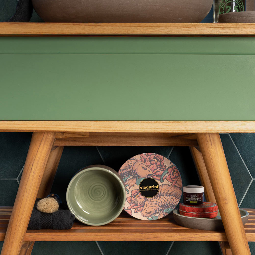 Free- standing bathroom accessories in refractory clay and dark earths handmade in Italy enameled inside with a green finish, a color that recalls spring and the flowering of plants, bringing back to the original contact with nature. Each element of the composition is characterized by particular details such as the neoprene pad on the base of the accessories to guarantee the protection of the support surfaces and the dispenser with pump in matt black metal to ensure optimal dispensing of the soap. The countertop accessories are elegant and fascinating, particularly functional with unique reflections that create exclusive atmospheres.