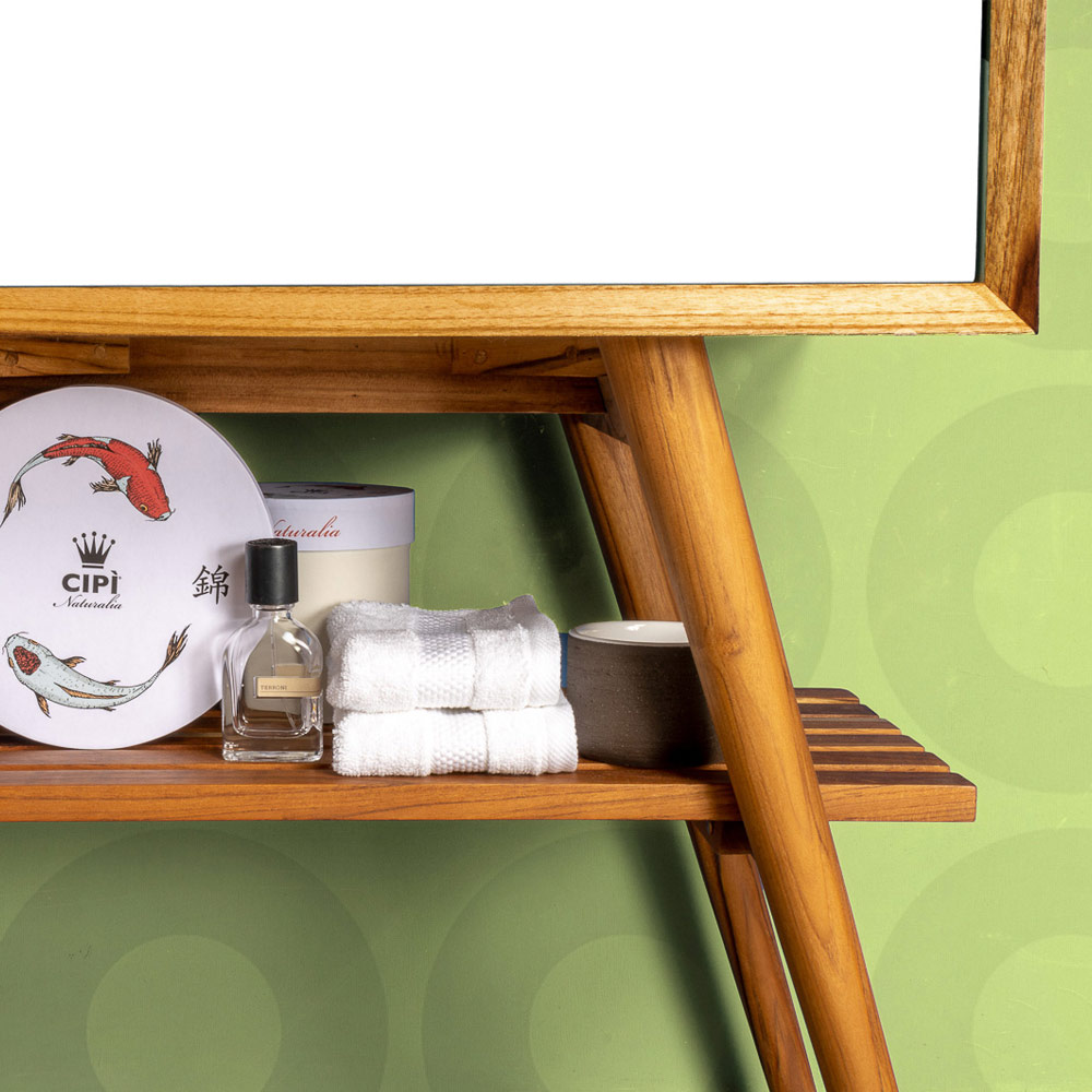 Free -standing bathroom cabinet with recycled natural teak structure and flap drawer in white mahogany wood , a color that represents the concept of peace, freedom, purification and a new beginning, bringing to mind the whiteness of snow and the brightness of nature in the its purest form. Its structure is characterized by simple shapes and practical spaces ideal for organizing the bathroom area in an elegant and functional way for an original result with a strong modern personality .