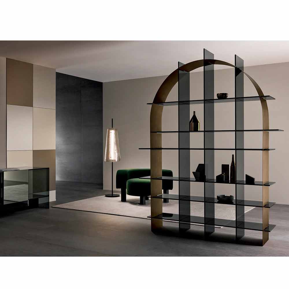 Freestanding living room bookcase in smoked glass and bronze arch geometry, luxury made in Italy.