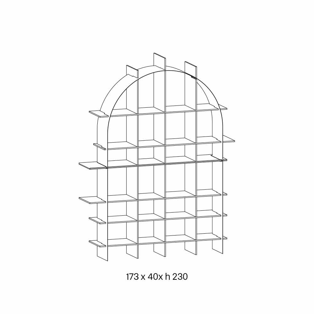 Its peculiarity consists in the interlocking structure made of arc- shaped thin sheet metal in a brushed bronze finish that integrates with the composition giving an effect of extreme refinement and geometry.