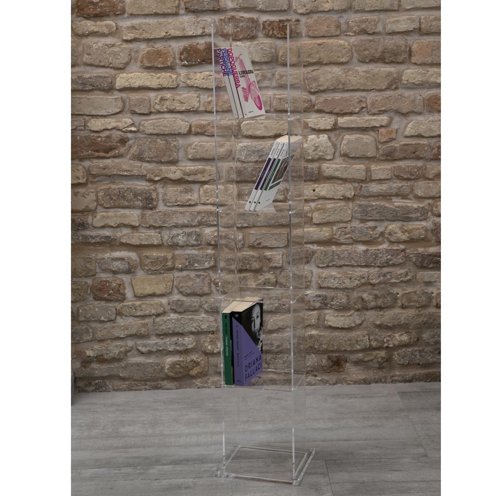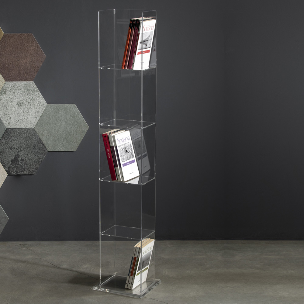 This freestanding bookcase is a piece of furniture entirely made of transparent acrylic crystal with a 5 mm thick column structure and 4 mm shelves.