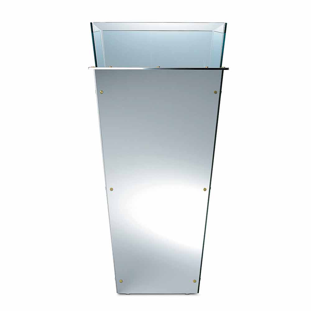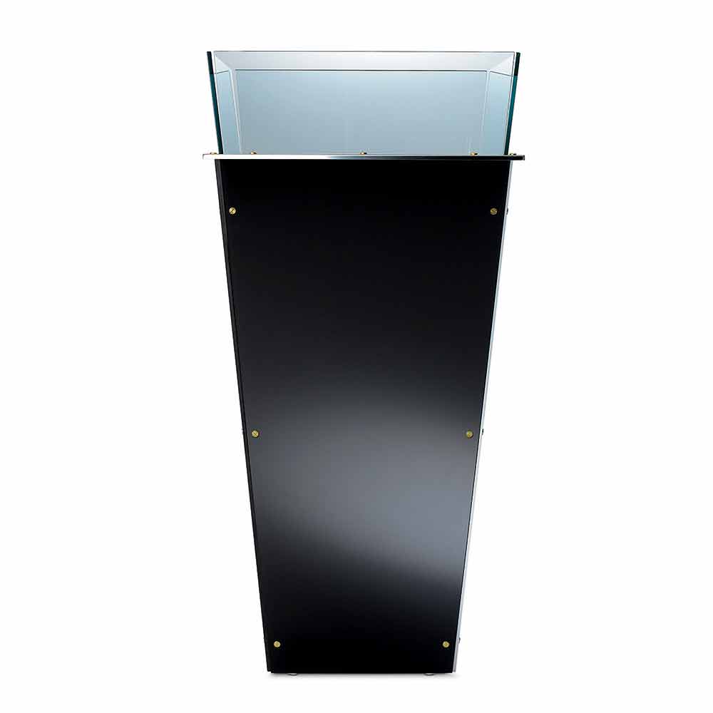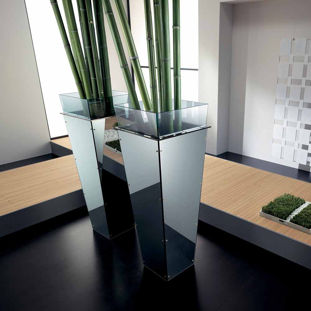 This free standing vase available in different sizes is characterized by interchangeable side panels in multiple finishes such as: black lacquered glass, white lacquered glass, mirror or leather.
