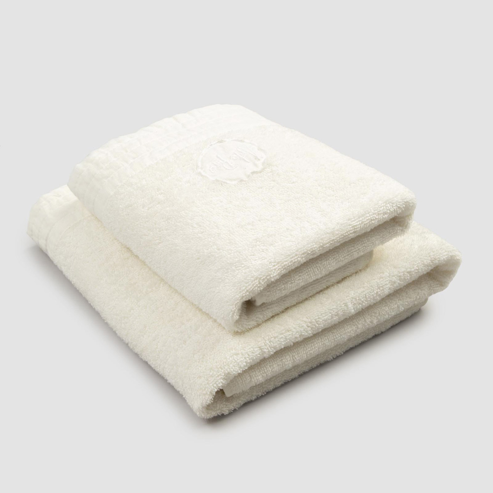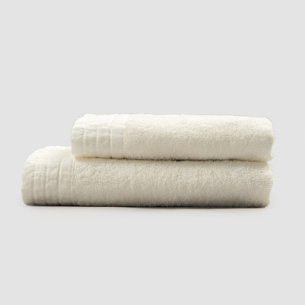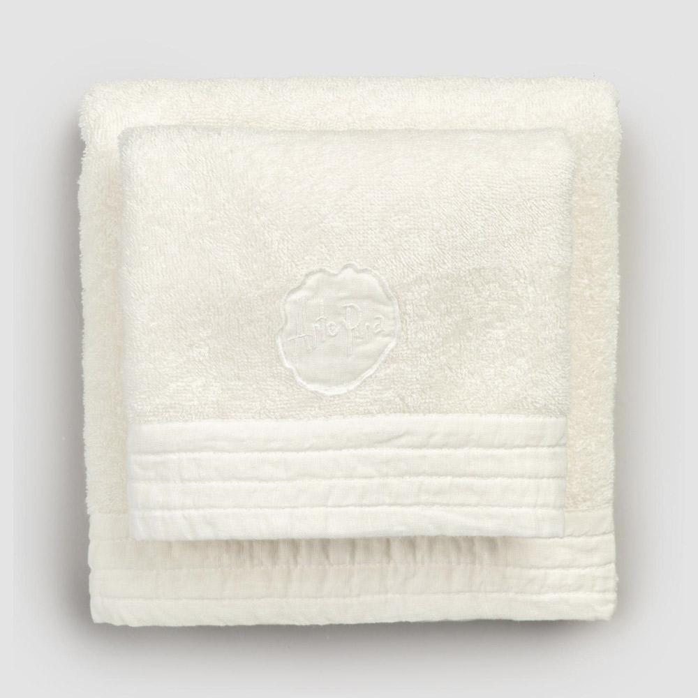 Pair of face and guest towels in cotton terry and linen blend border, high quality made in Italy.