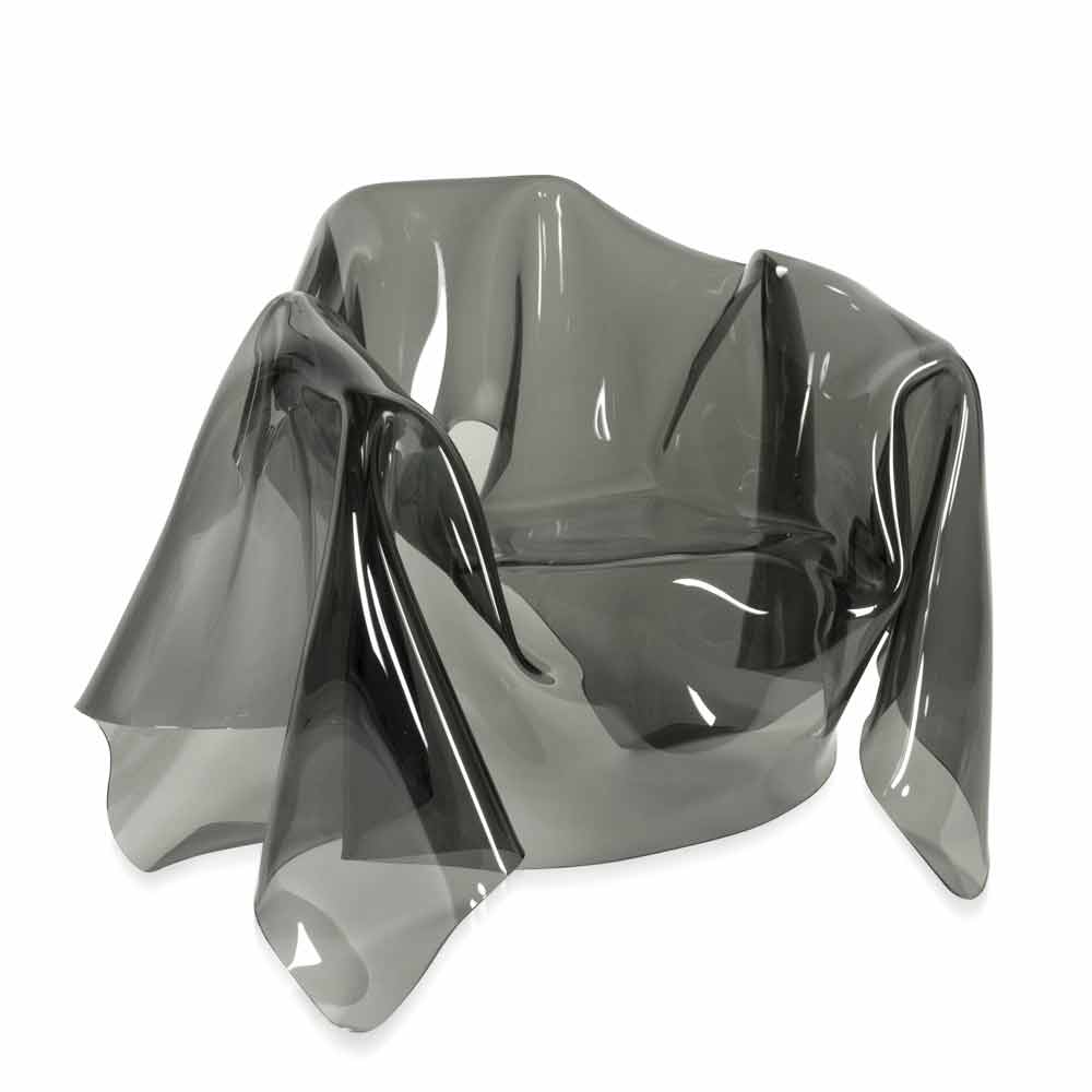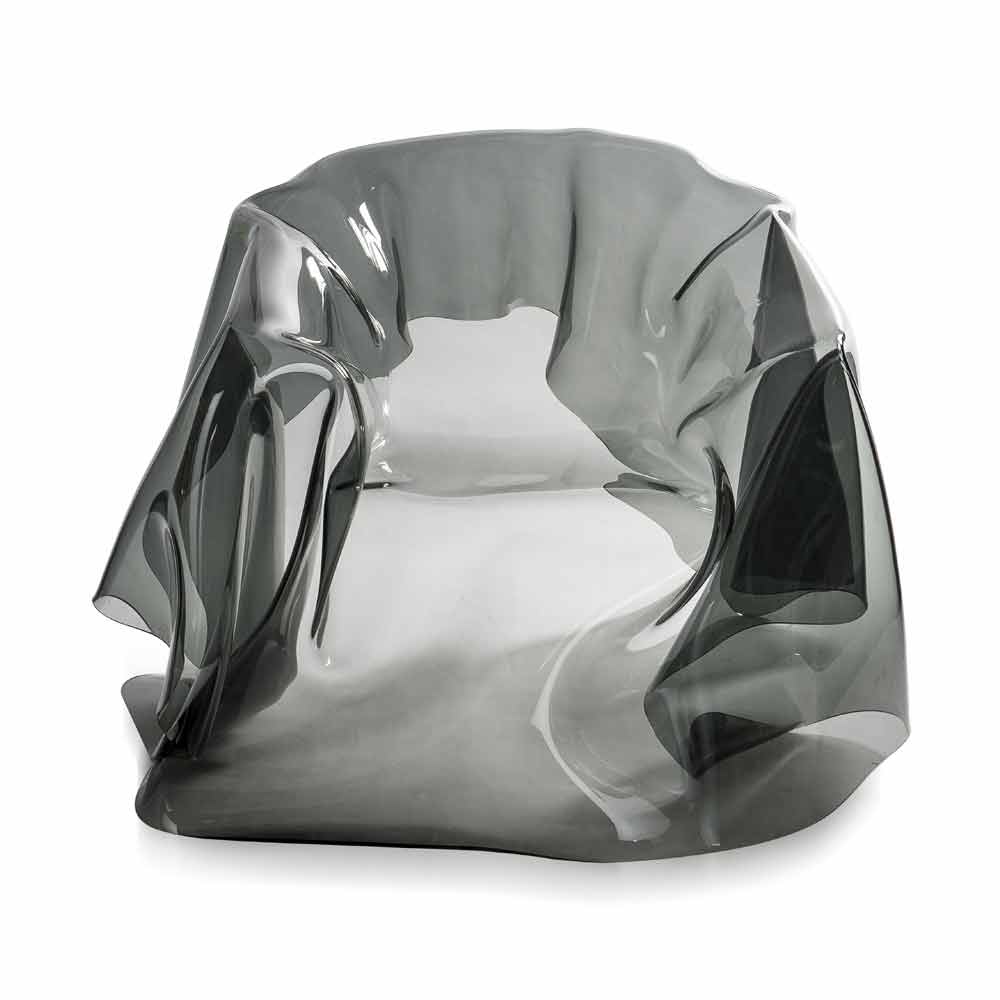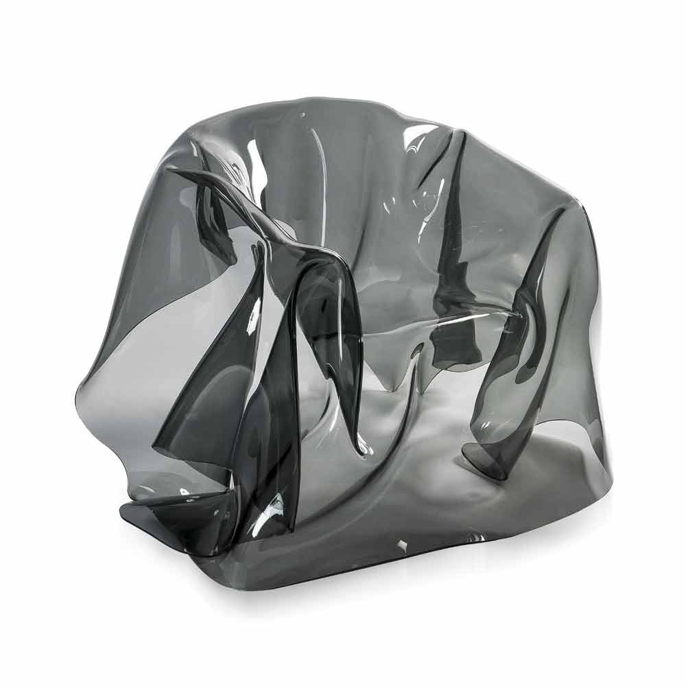 Each "Paris" armchair is a unique modern art piece. From a 100% pure PMMA fumé plexiglass sheet hand-draped, comes a unique armchair. Self-supporting, the armchair can accommodate 1 seater.