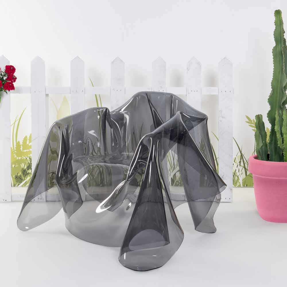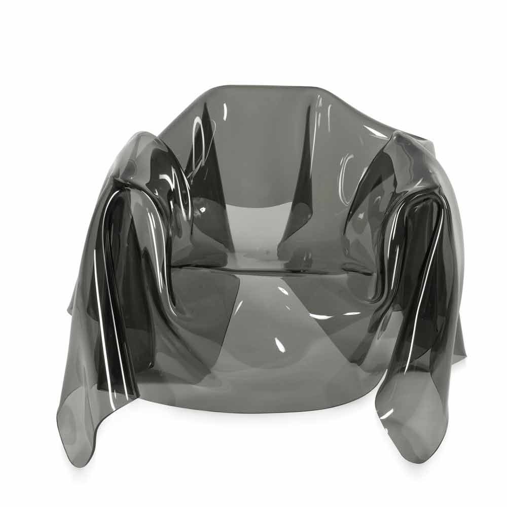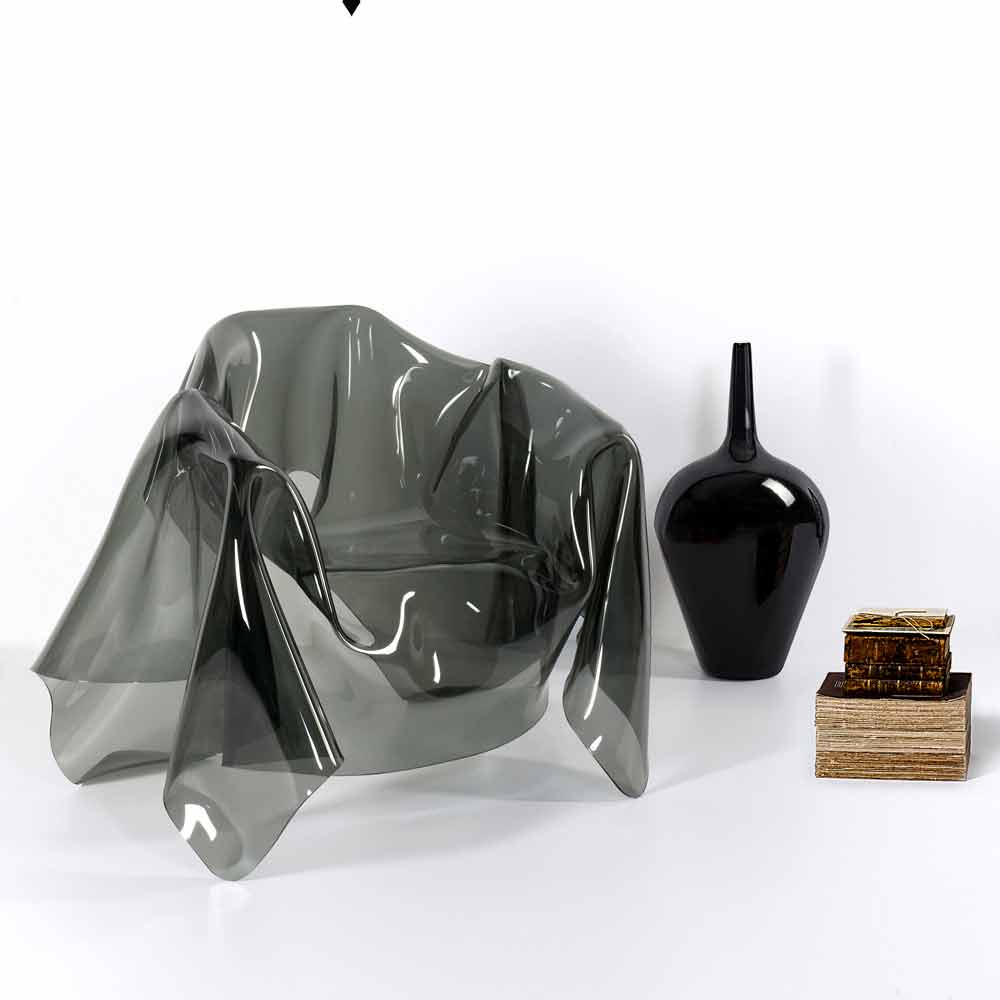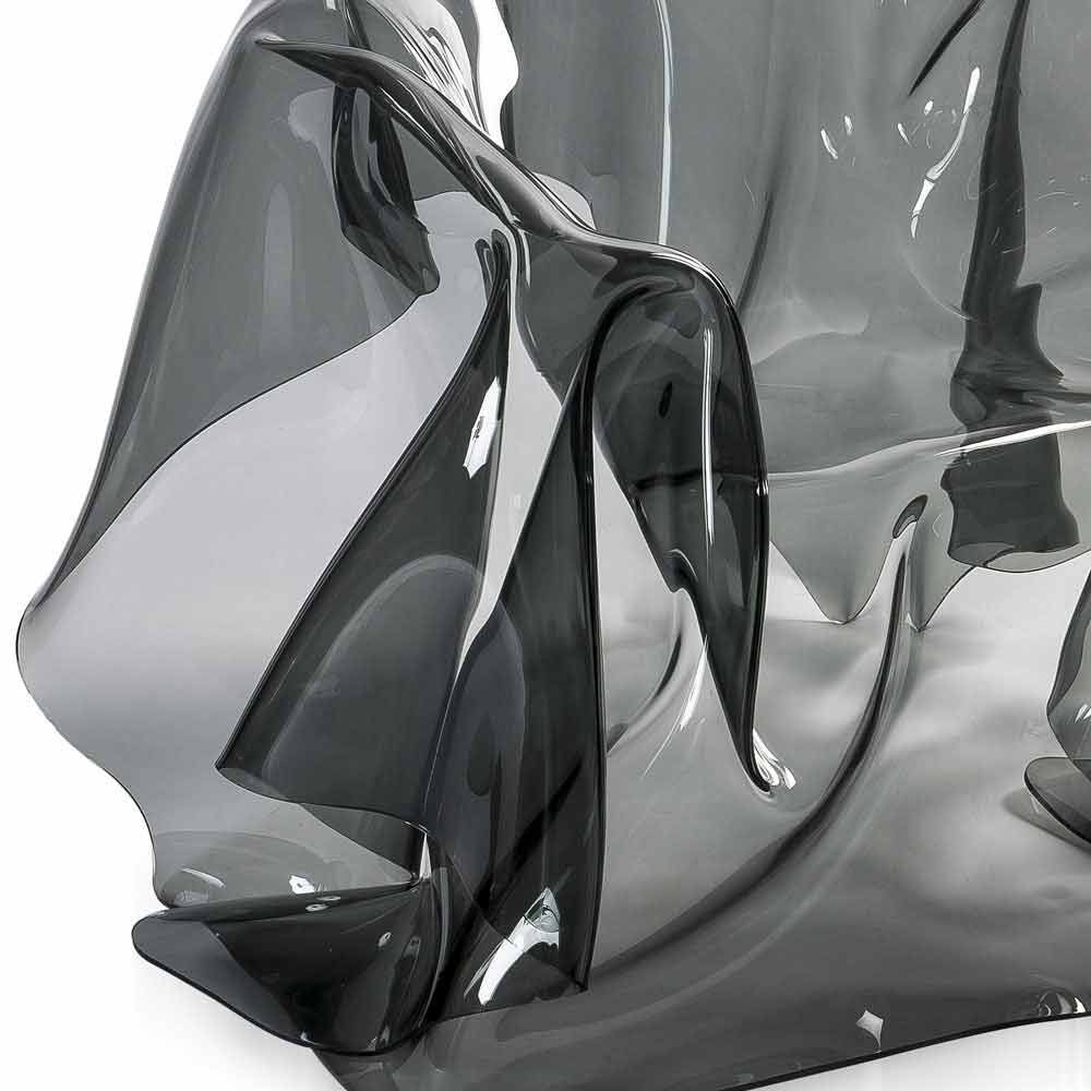 Each "Paris" armchair is a unique modern art piece. From a 100% pure PMMA fumé plexiglass sheet hand-draped, comes a unique armchair. Self-supporting, the armchair can accommodate 1 seater.