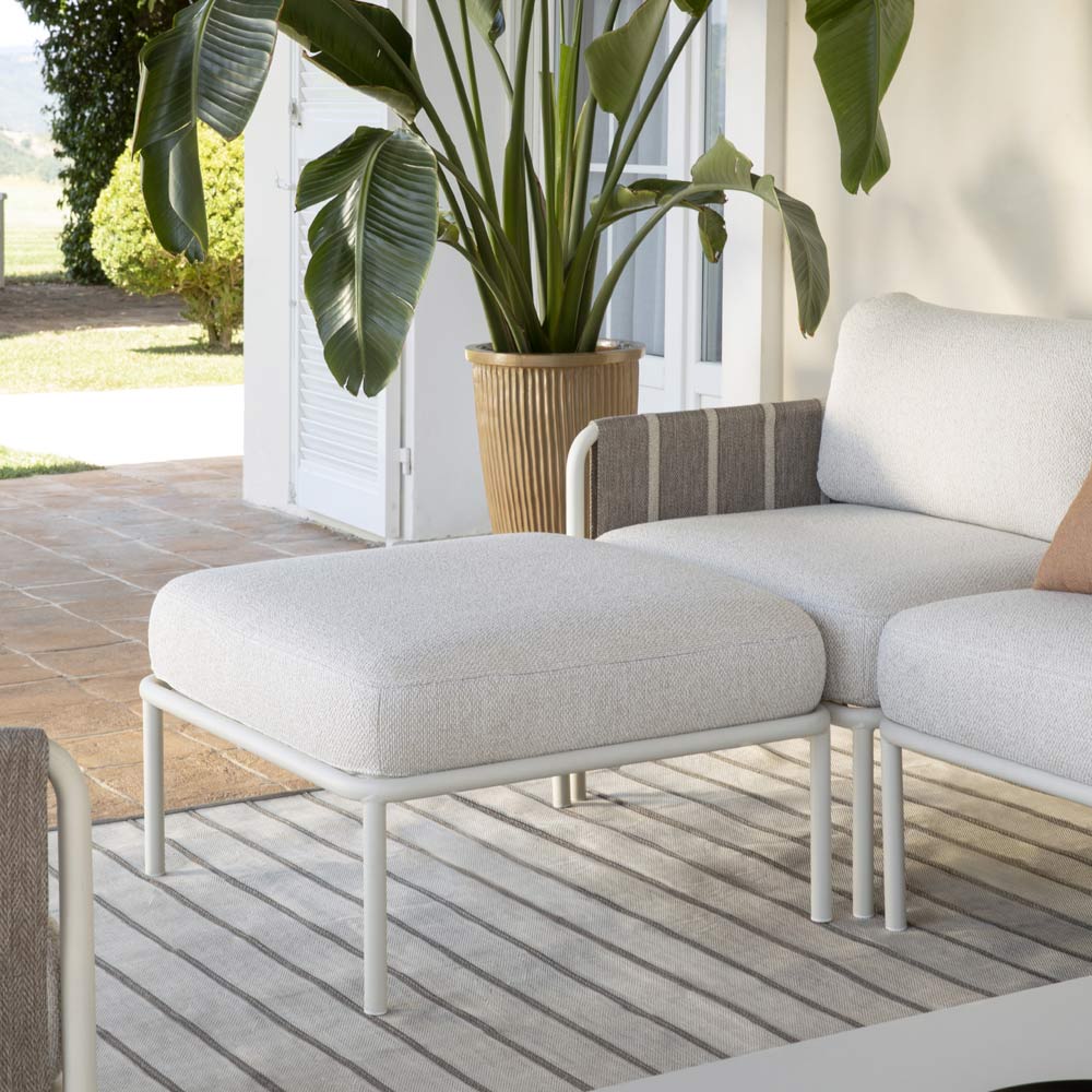 Sofa (2 corner elements + 1 central one): structure in powder-coated galvanized iron with pearl white finish, seat in elastic belt, cushions in white finish fabric and washable and removable armrest cushions.