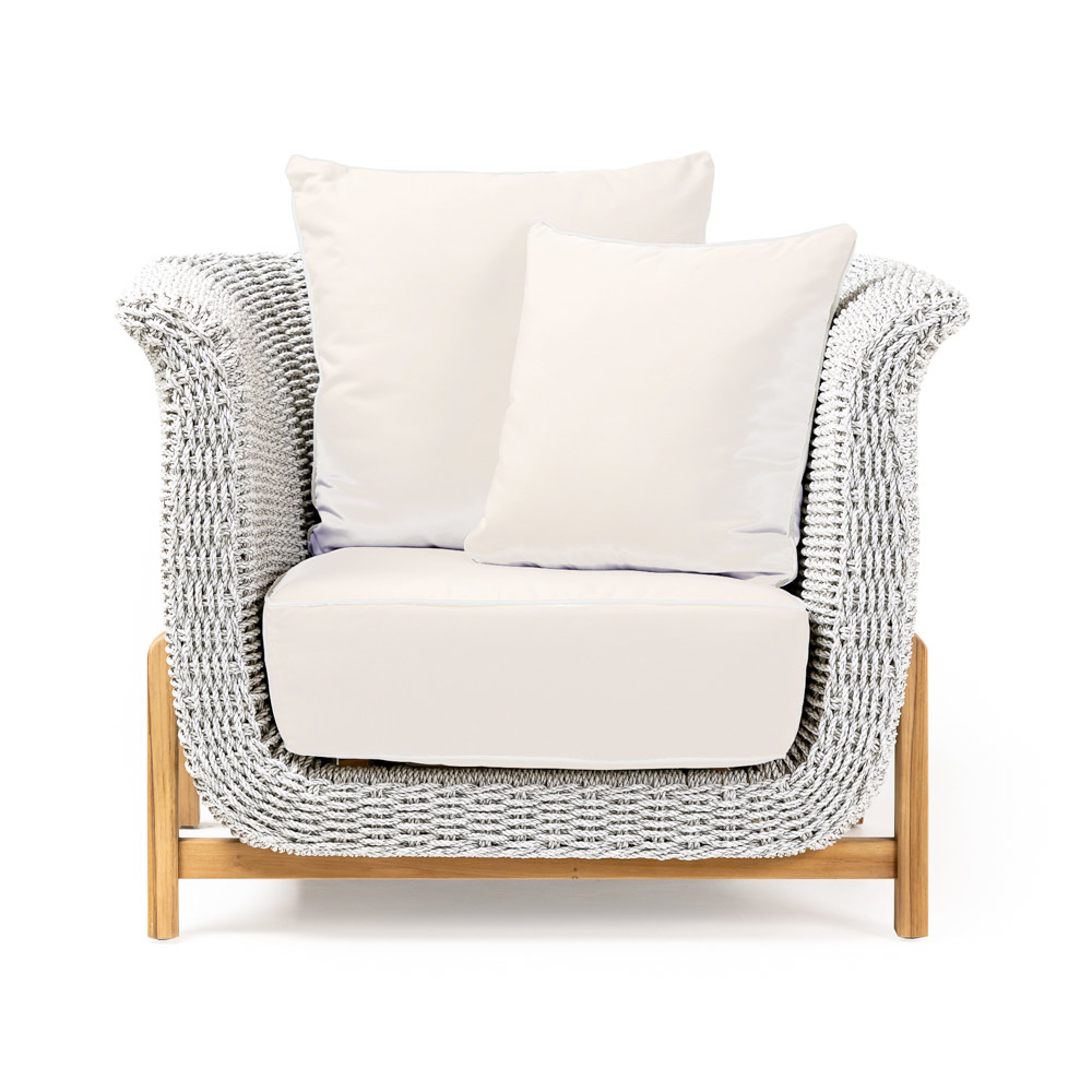 This outdoor armchair is made with an internal structure in epoxy powder coated aluminum frame , teak base and hand-woven VRO rope insert. It is complete with seat and back cushions in water-repellent fabric in Havana grey .