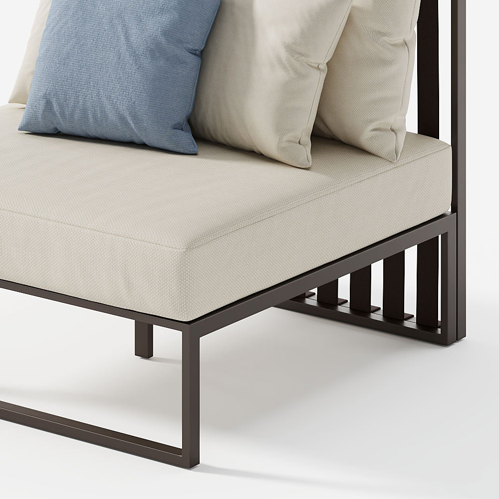 Garden armchair with central structure in epoxy powder coated aluminum (with shockproof and scratchproof characteristics) and polyester belts with seat and backrest in cushions upholstered in Irisun® Living Solids fabric entirely Made in Italy . The feature that makes this product unique is the alternation of solids and voids that lightens the structure making it float in space. This furnishing set is perfect for giving the room a unique and sophisticated touch and, thanks to the materials used, quality and resistance over time is guaranteed. The comfort of the seat allows you to create a welcoming and informal atmosphere suitable for all occasions.