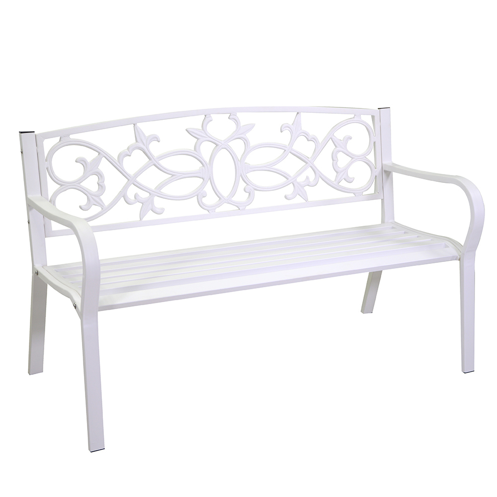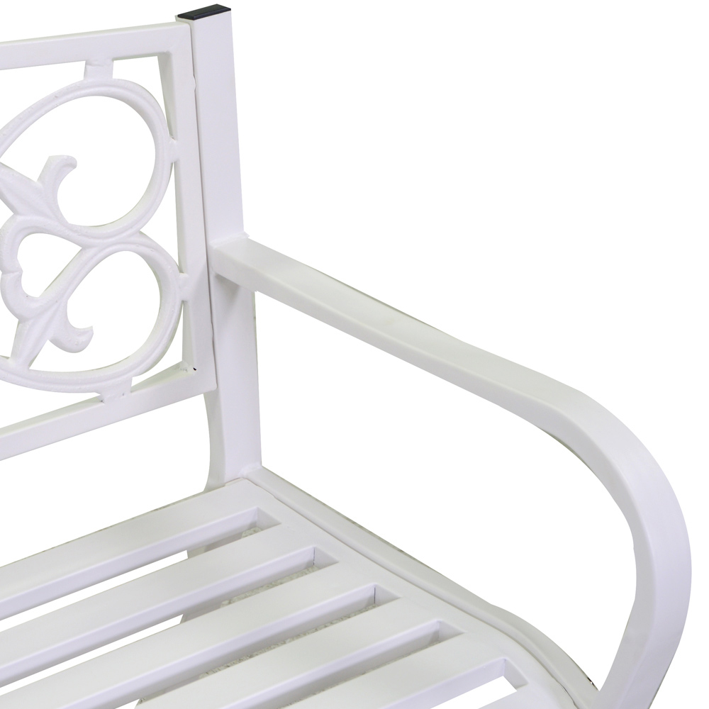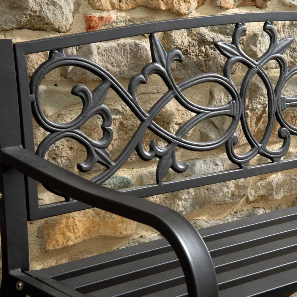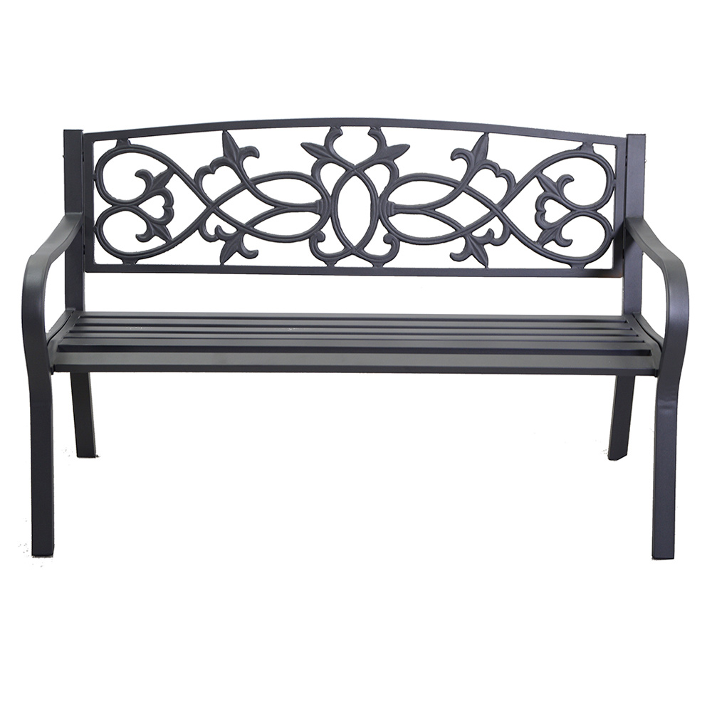 The ornamental detail on the back combines classic motifs with a touch of modernity, creating a visually appealing focal point. Crafted from durable metal , this bench is designed to last, withstanding the elements and maintaining its aesthetic beauty without requiring excessive maintenance.