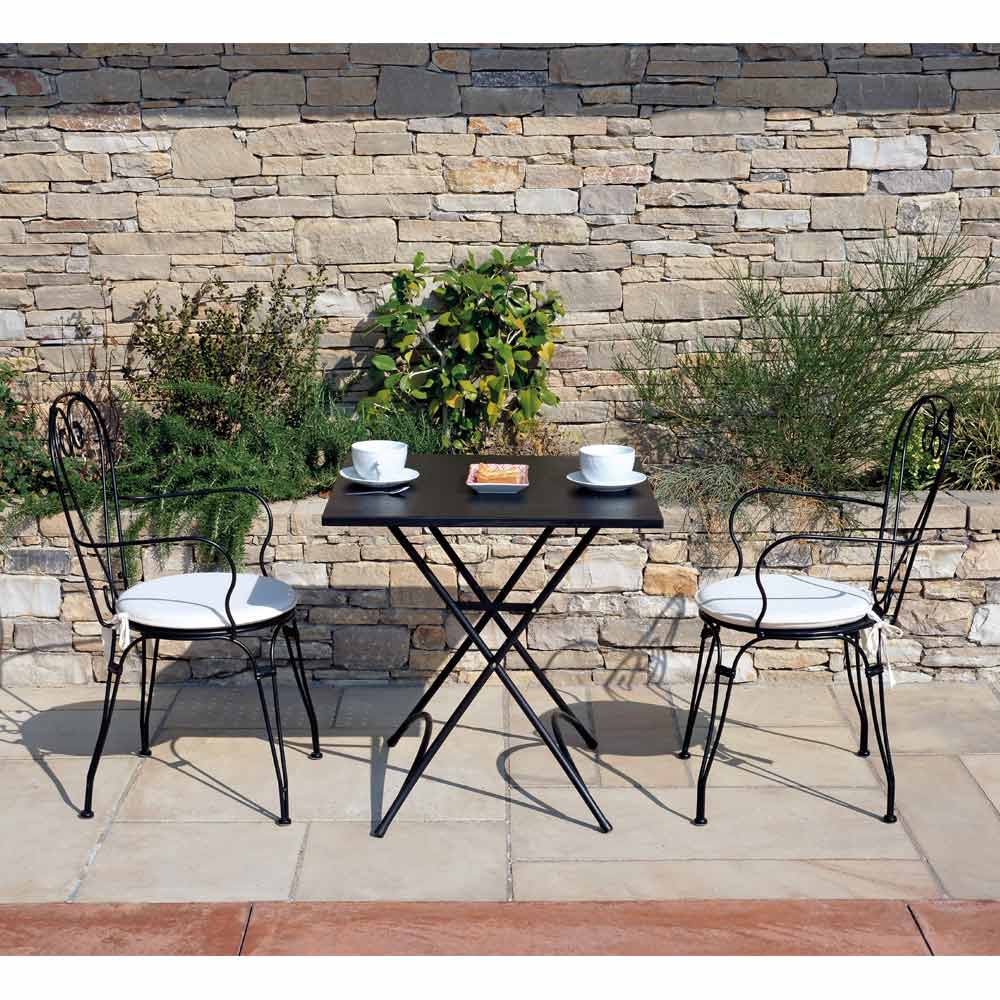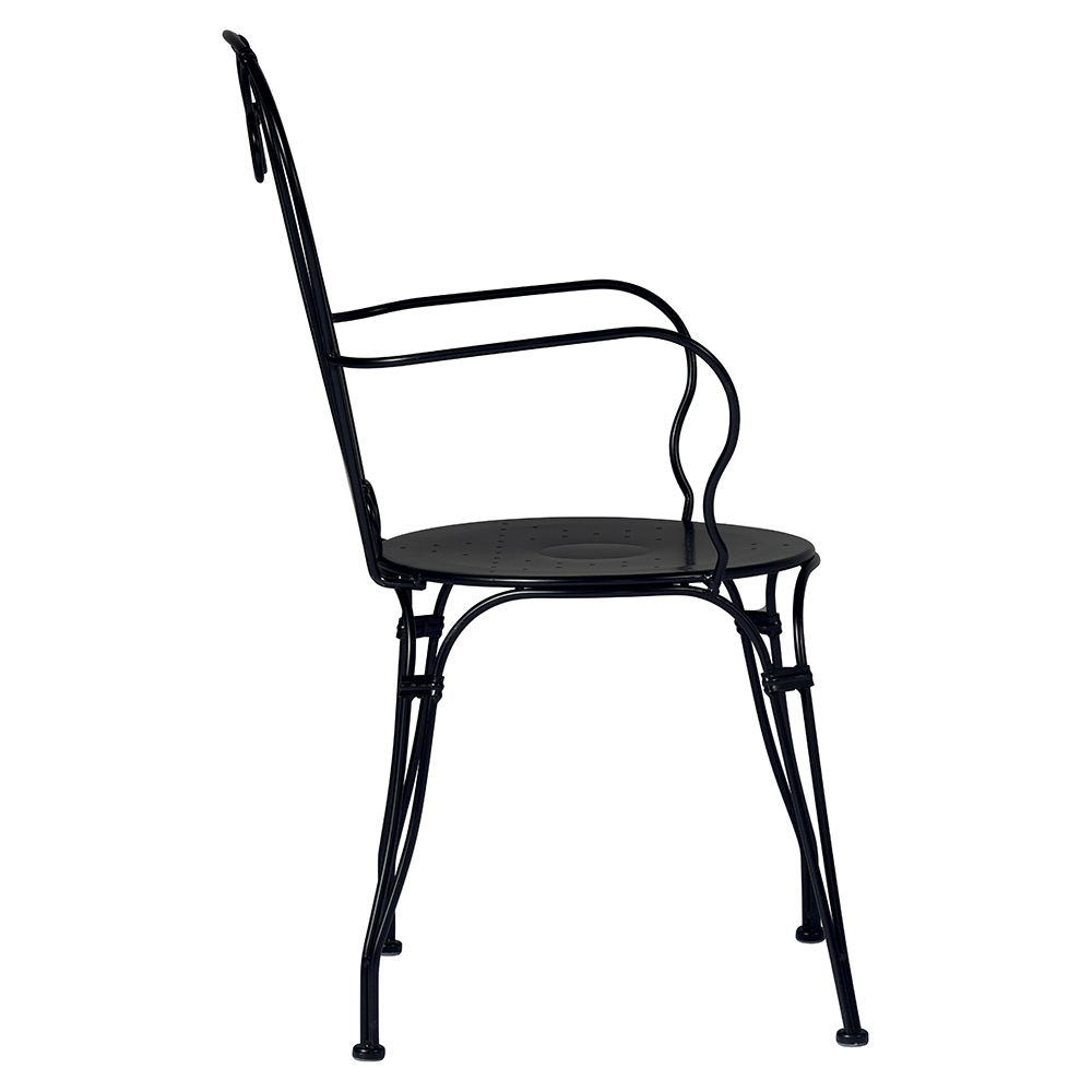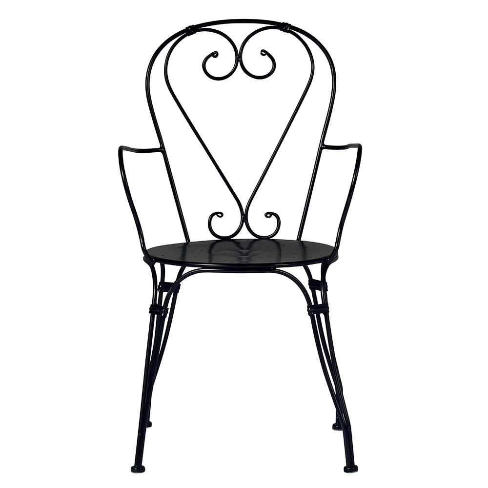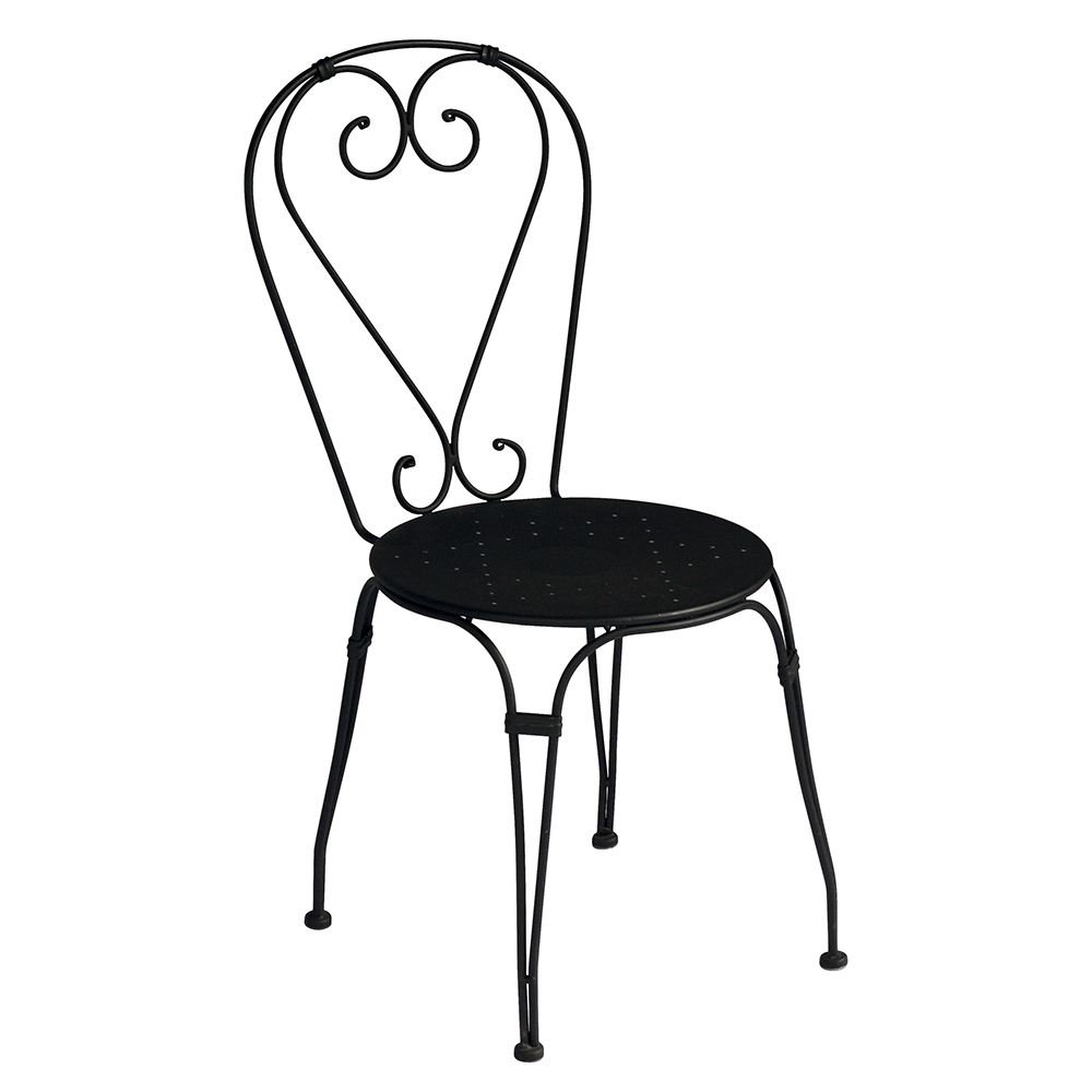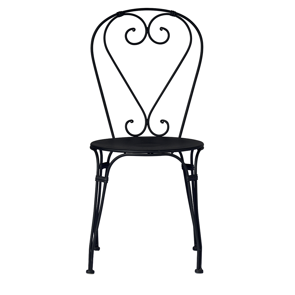 Stackable outdoor chair with seat and structure made of black painted iron with anti-rust treatment. The garden chair is characterized by the heart-shaped design withsimple lines and sober shapes that make it particularly versatile thanks to the small size, lightness and manageability of its structure.