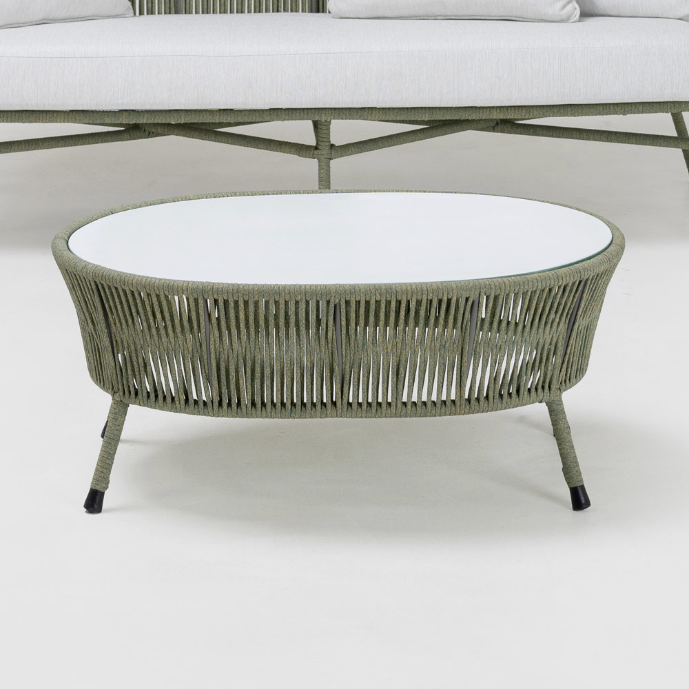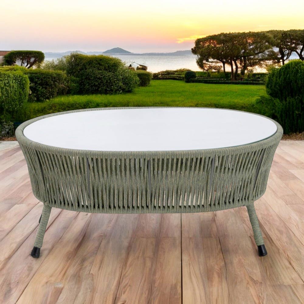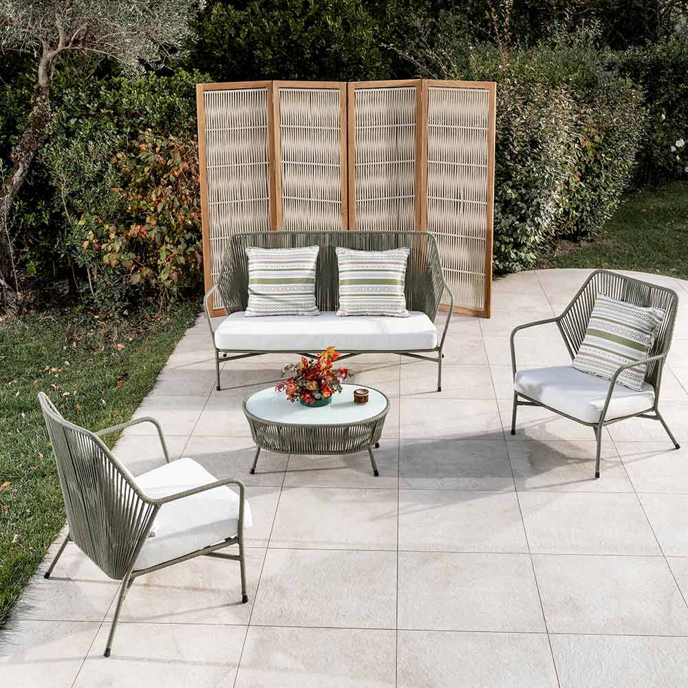 This garden table is ideal for enjoying outdoor spaces. Its design is contemporary, with a light structure in woven rope that creates a play of transparency and shadows, adding depth and visual interest to your garden or terrace.