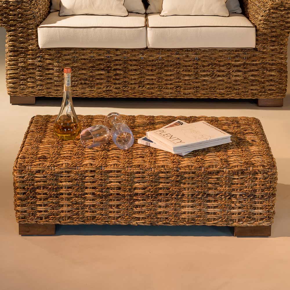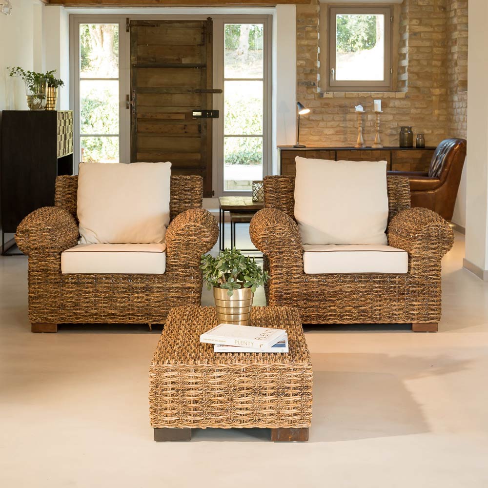 The coffee table belongs to a whole collection which is made unique by the rounded cylindrical armrests and a refined dense weave of natural abaca fibre, derived from the banana tree . The seats are large and equipped with comfortable cushions .