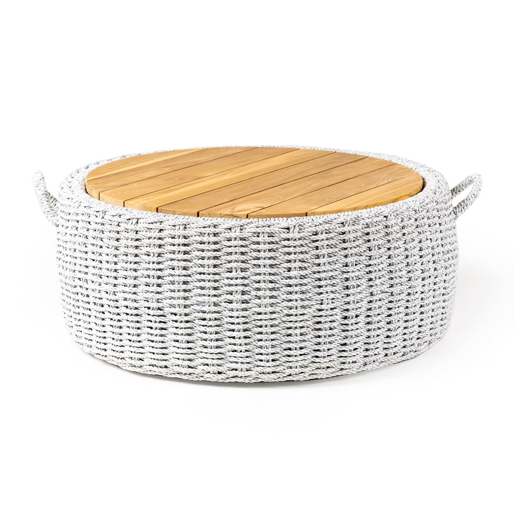 This outdoor coffee table is made with an internal structure in epoxy powder coated aluminum frame with teak base and hand-woven VRO rope insert. This collection combines the beauty of teak with the artisanal wisdom of weaving.