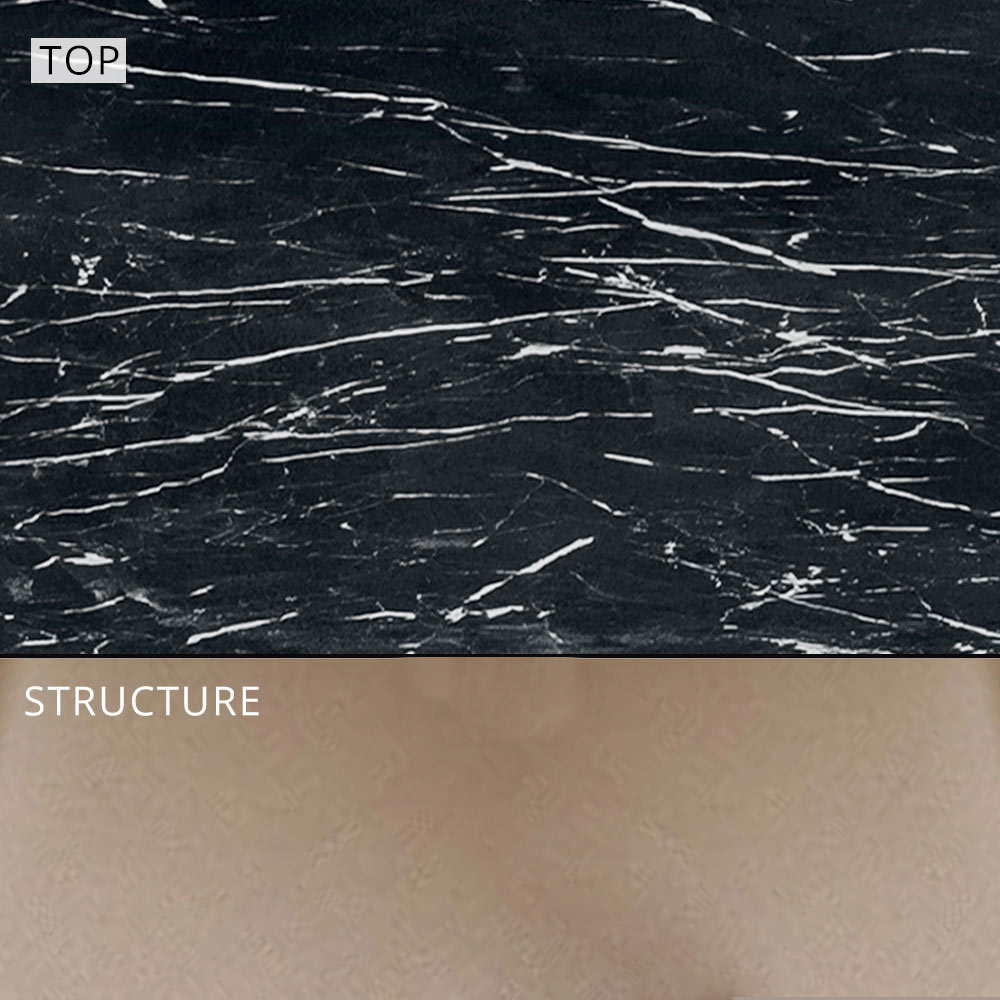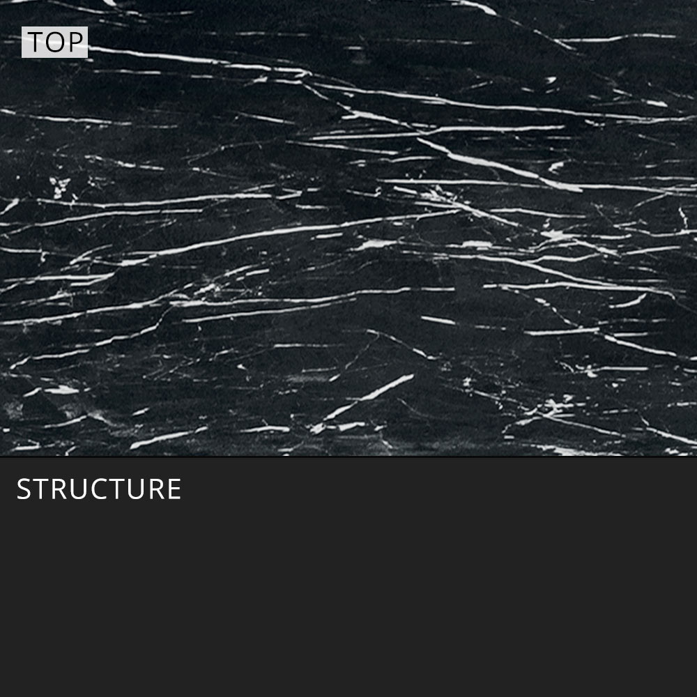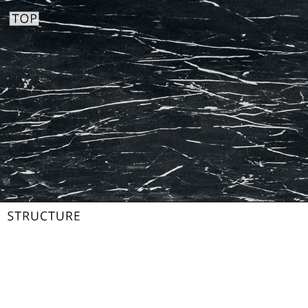 - gunmetal aluminum structure and black marble effect stoneware top