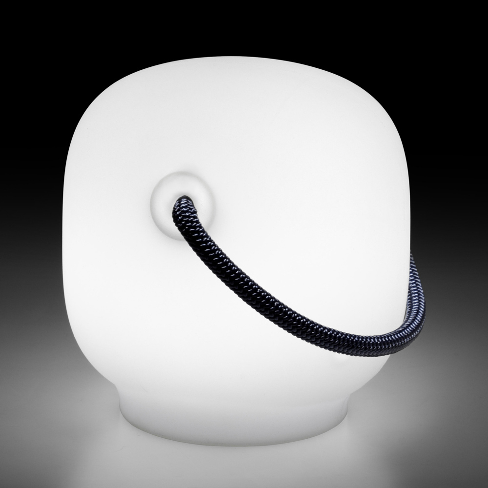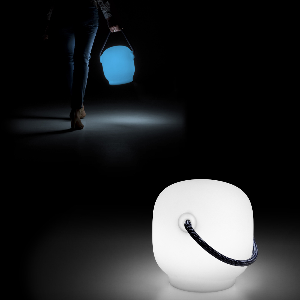 Outdoor lamp entirely made in Italy in matte finish polyethylene equipped with handle and practical RGB LED light kit. A portable lamp with small dimensions that creates an atmospheric light in any stylistic context. Its peculiarity is the power supply through an internal battery that allows, together with the practical colored rope handle, to facilitate movement, thus creating a real re-fillable lantern. Its modern and avant-garde design makes it a perfect solution both for domestic outdoor spaces and for contract environments in which to play with different styles and aesthetics for an exclusive and refined result.