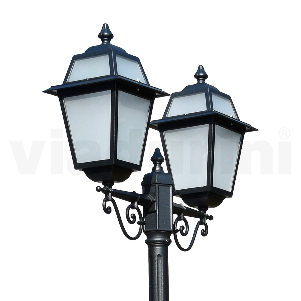 This cast aluminum street lamp with its anthracite finish is a stylish choice for any outdoor setting. With a classic and elegant design, it features crafted details that evoke an atmosphere of times gone by. The 2 lanterns, with attention to the smallest details, spread a warm and soft light, ideal for creating a luminous path in your garden or for classy delimiting an outdoor relaxation area. Solidity and beauty come together in this street lamp, designed to last over time and resist atmospheric agents. Elegant and functional , it will be the luminous signature of your outdoor space.