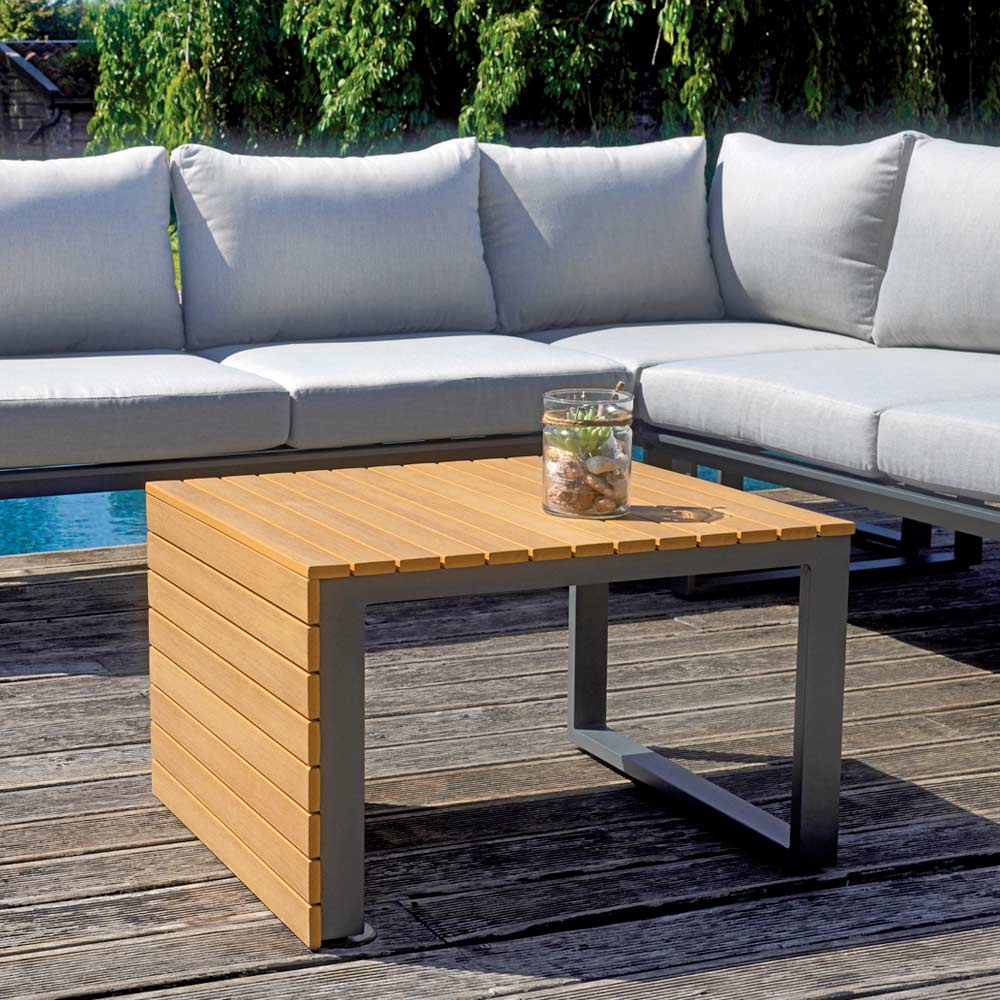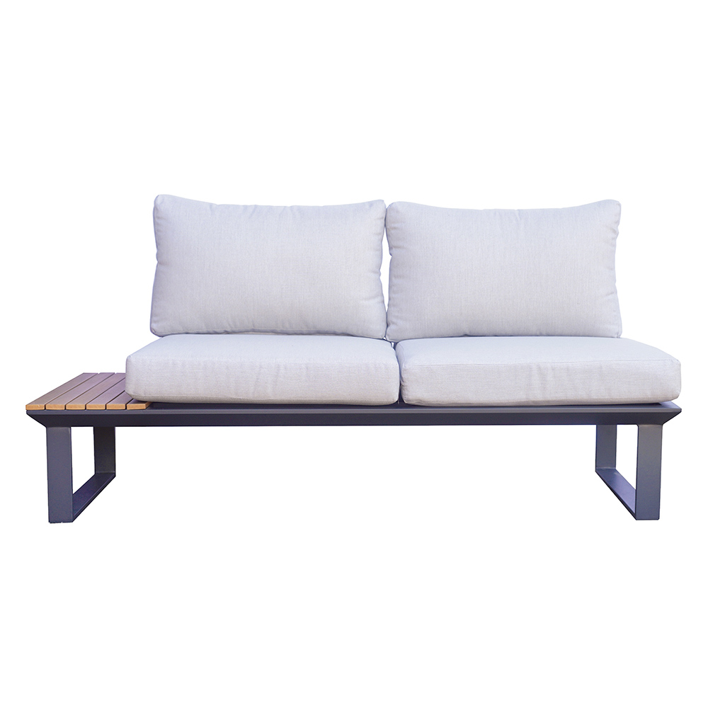 Outdoor lounge set including 2 2-seater sofas and a corner sofa made of anthracite aluminum and with removable gray cushions . The 2-seater sofas are equipped with side tables and the central table is also included, all made with anthracite aluminum structure and resin wood top.