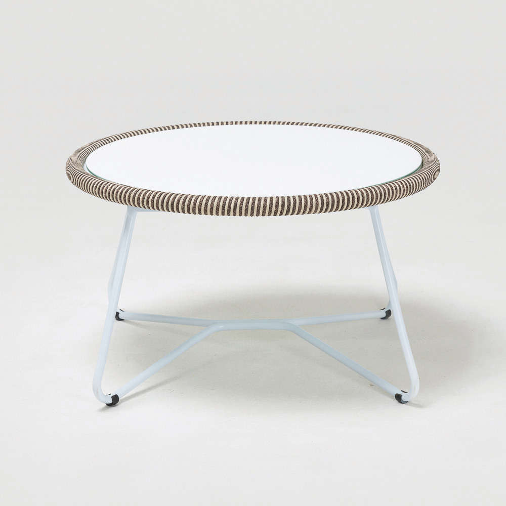 Also included is the coffee table made with an aluminium structure, Olefin/PP CORDA weave with a two-tone pearl white and cappuccino finish and a white lacquered glass top.