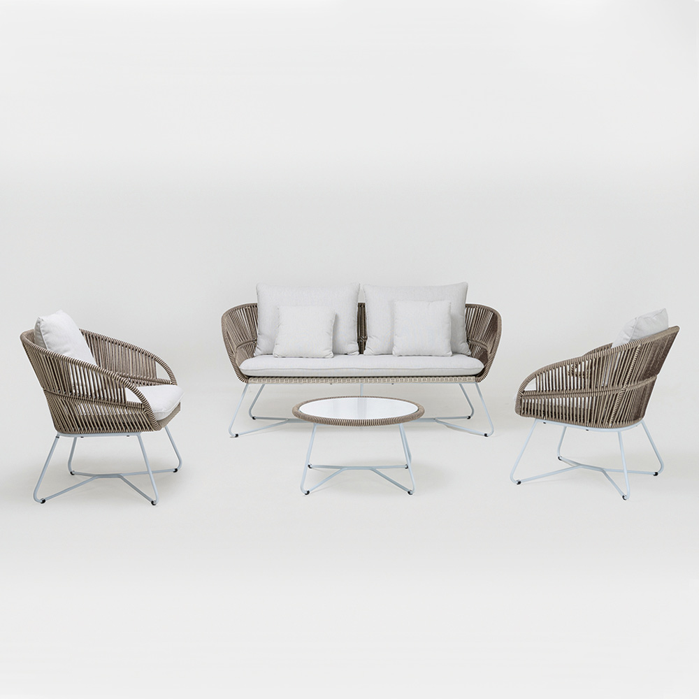 The rope structure adds a touch of resistance and durability against the elements, maintaining its beauty over time. The design is further enhanced by aluminum details, which give it a fresh and modern air, making it stand out in gardens, terraces or poolside. The matching coffee table, with its glass top, is the ideal complement to host drinks and snacks, making it the perfect set for your guests and for your outdoor evenings.