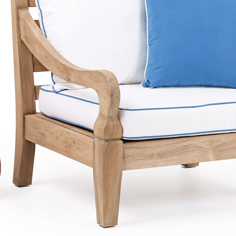 Outdoor lounge set in brushed natural teak wood and cushions included.