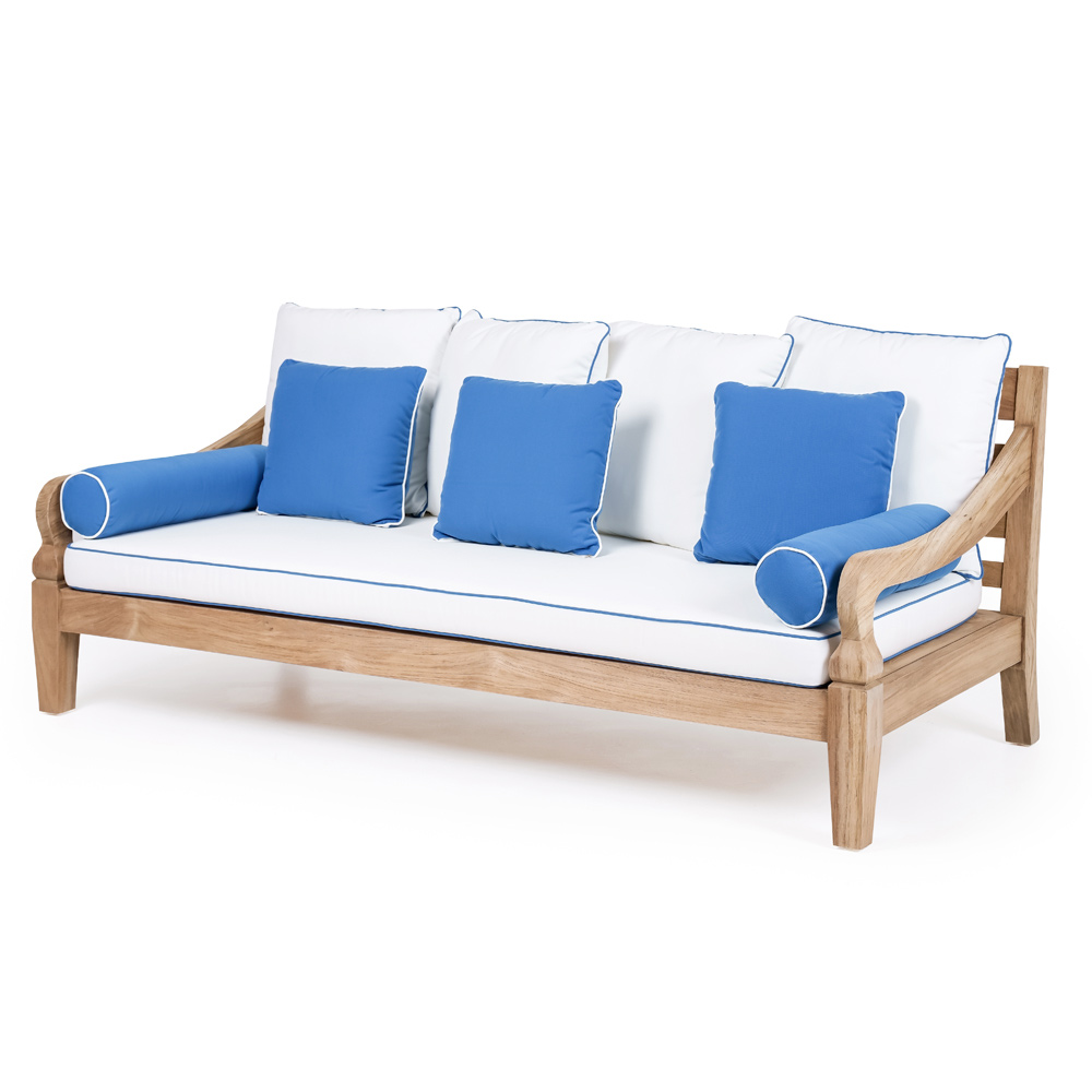 outdoor fabric in the colour “white” with contrasting “ocean blue” piping and blue decorative cushions with white piping included.