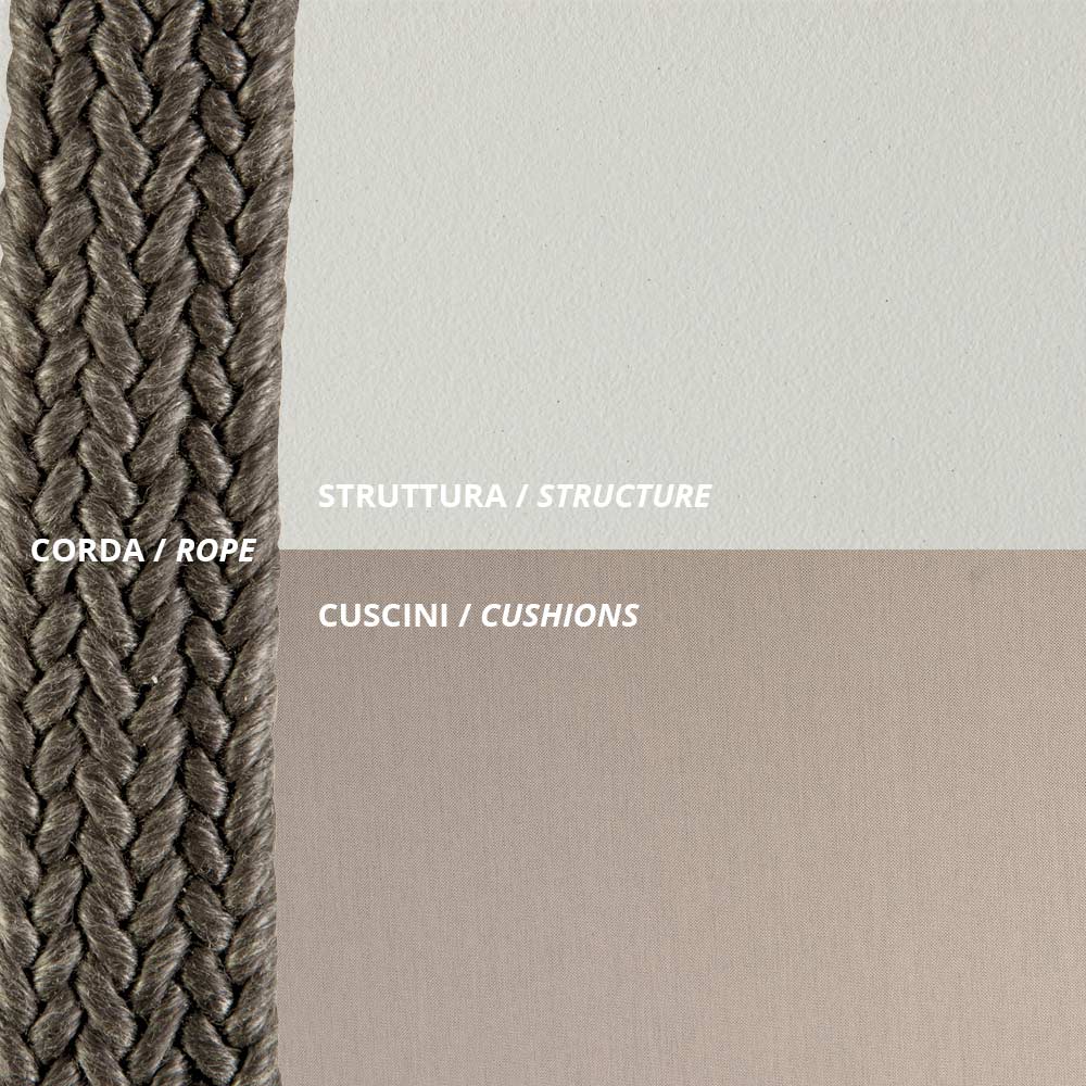 Outdoor furniture pouf in galvanized steel and rope completely made in Italy with seat cushion included . The galvanization allows a greater resistance of the material finish to corrosive atmospheric agents while the rope is resistant to chlorine and solar rays as well as anti-mold. The cushion is made of material resistant to UV rays and water that maintains the color for a long time making the swing a perfect element to furnish any outdoor environment.